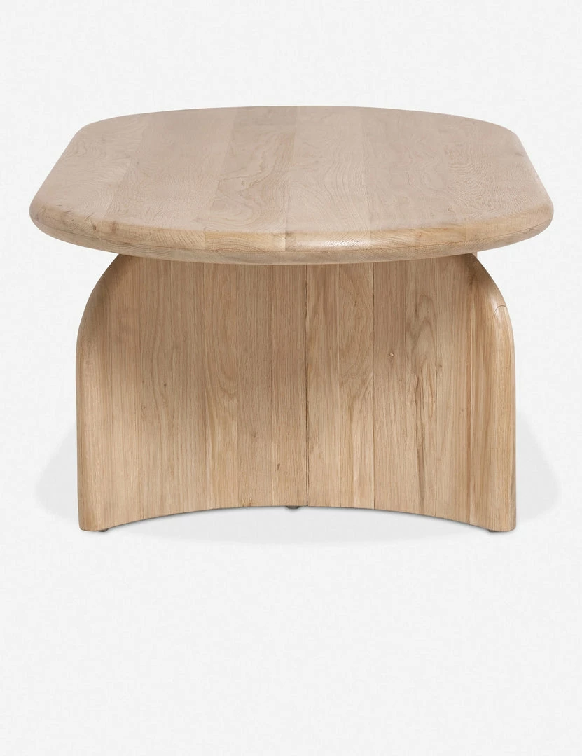 Sculptural and dynamic, the design of the Ada Oval Coffee Table makes it feel as though its oval tabletop sits delicately balanced atop its curved legs. Constructed from solid oak wood, organic variations in the grain shine through its natural finish. Sit this wood coffee table with a clean-lined sofa or sectional and richly-colored accent furniture.