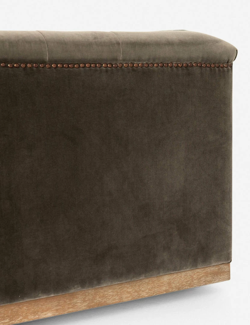 This tufted velvet sofa with aged bronze nailhead details gives a traditional library feel while the rectangular wood base gives it a modern and elevated edge. We love styling it with mid-century pieces and industrial accents for a layered look.