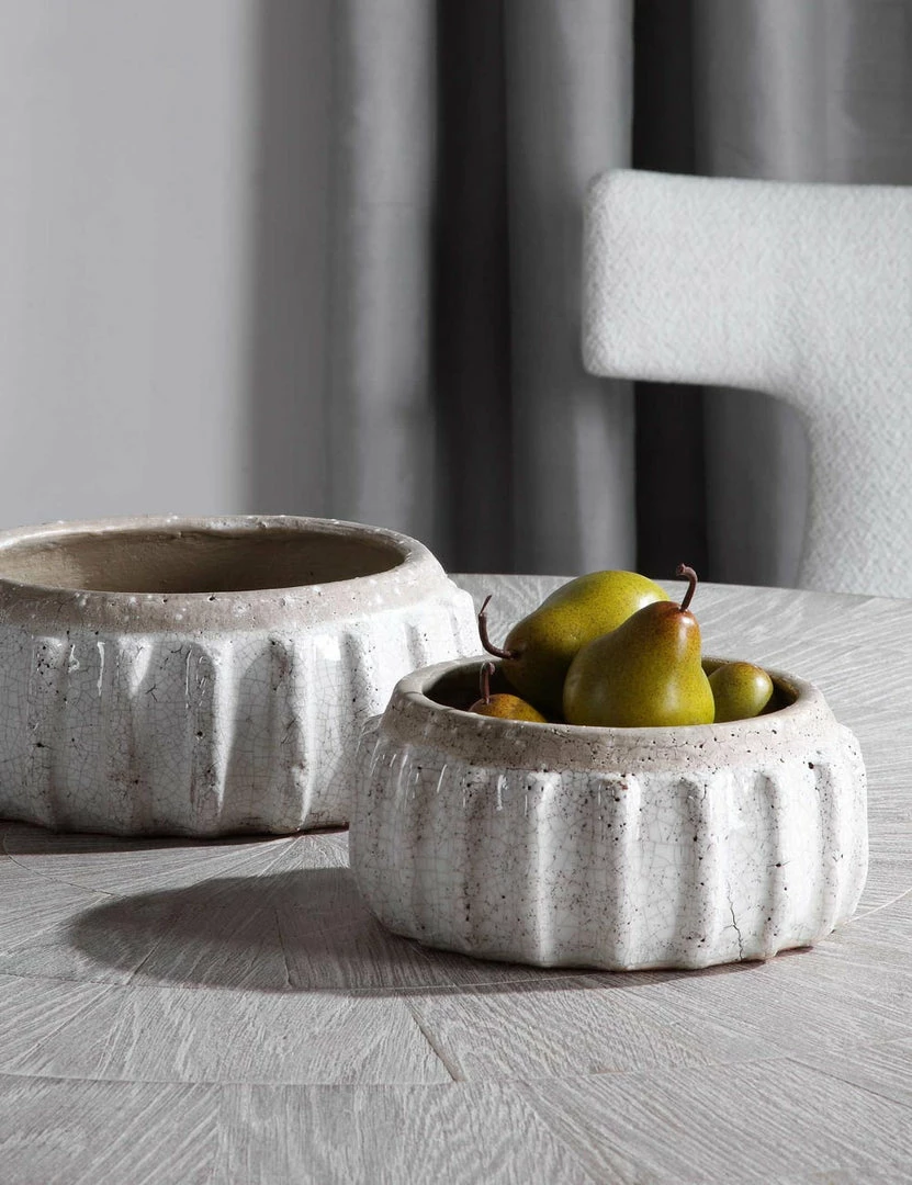 A ribbed edge and antiqued finish mark these bowls with a seasoned texture. As a dynamic pair, these decorative bowls offer a stylish centerpiece that you can fill with fresh decor.