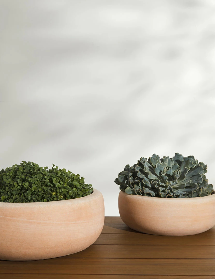 Fired at a high temperature for durable outdoor style, this set of terracotta planters is the perfect touch of warmth and texture for your garden or terrace. The low profile and earthy finish are ideal for grounding succulents and other low-growing plants with a rich, artisanal base.