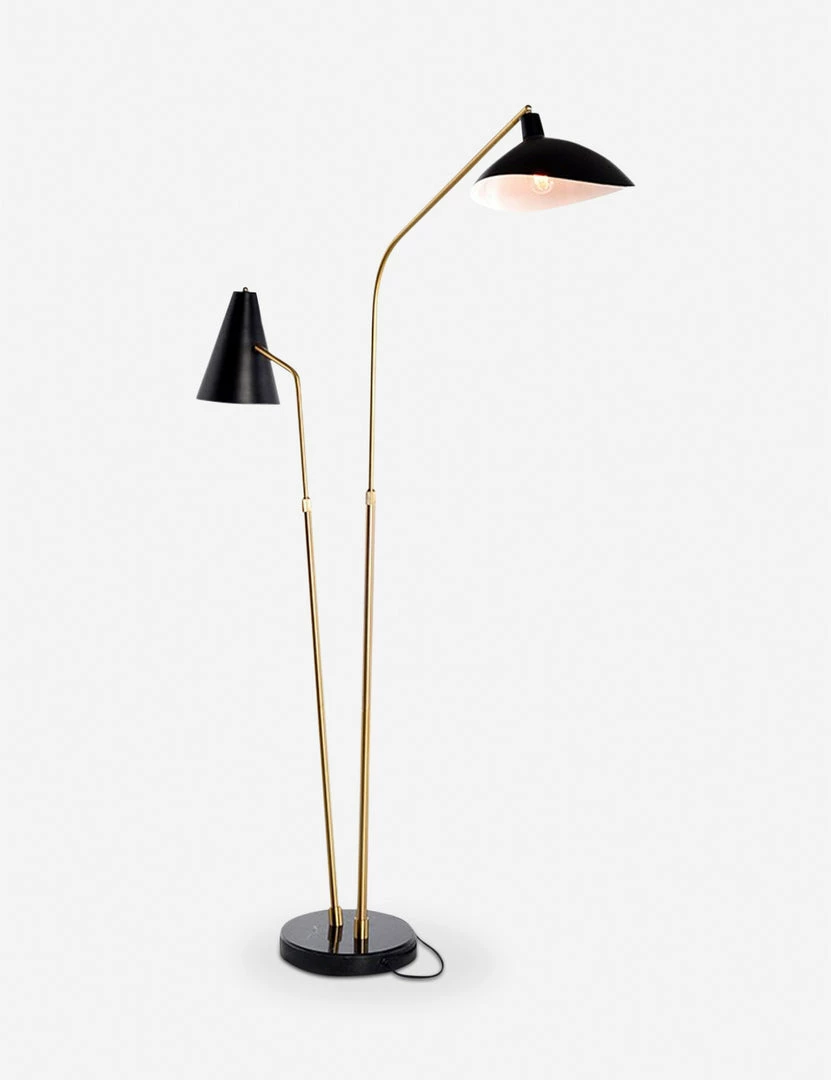 With a black marble base and dual arm light sources, the Annika floor lamp adds thoughtful style to your living room, bedroom, or office. Antique brass tubing provides a glamorous pop against its black details.