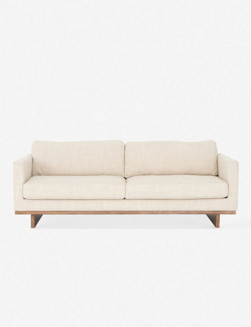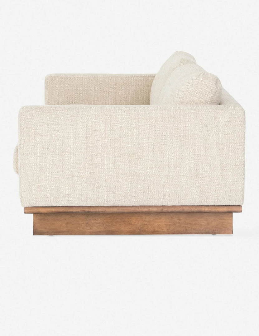 Add this spacious sofa to your living room for a homey, contemporary look. The plush cushions are ready for family movie night, while the wooden platform frame adds a farmhouse-inspired touch to the whole look.