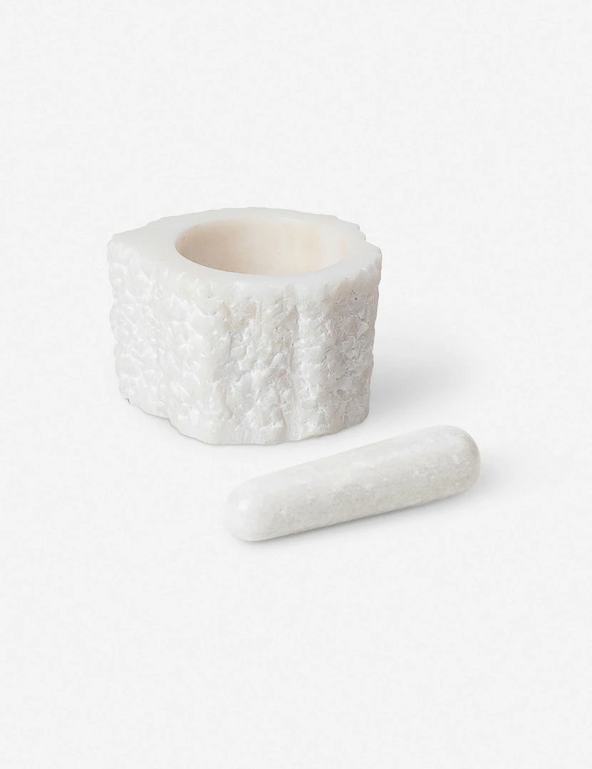 A raw mineral texture marks the face of this mortar, complementing the polished well and pestle. Carved from quartz, this set is perfect for grinding and blending herbs and spices, plus its organic lines offer a unique touch on your counter or shelf.