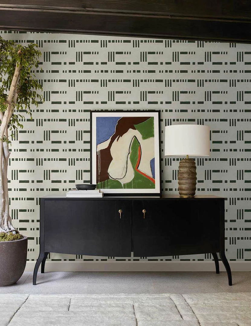 This warm and playful yet balanced design pairs rich hues with a dash and bar motif to offer a refined home wallpaper with chic style notes. Layer this versatile wallpaper into any space in need of a refresh, from the entryway to the bathroom.