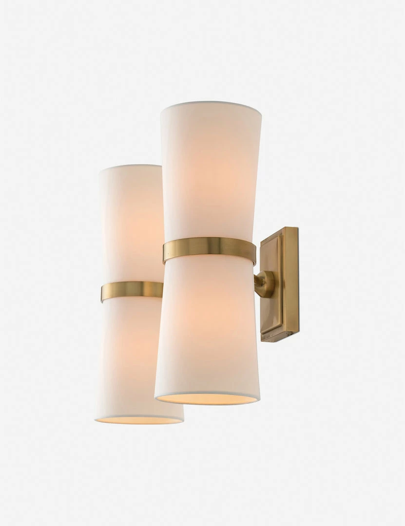 Double your light (and your style) with this classic-meets-contemporary wall sconce. Mounted on an antique brass base, it features two linen pillar shades with a tapered look for a more modern feel.