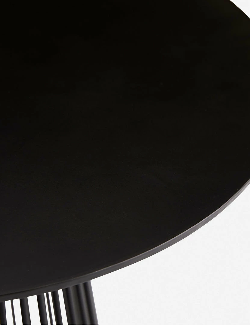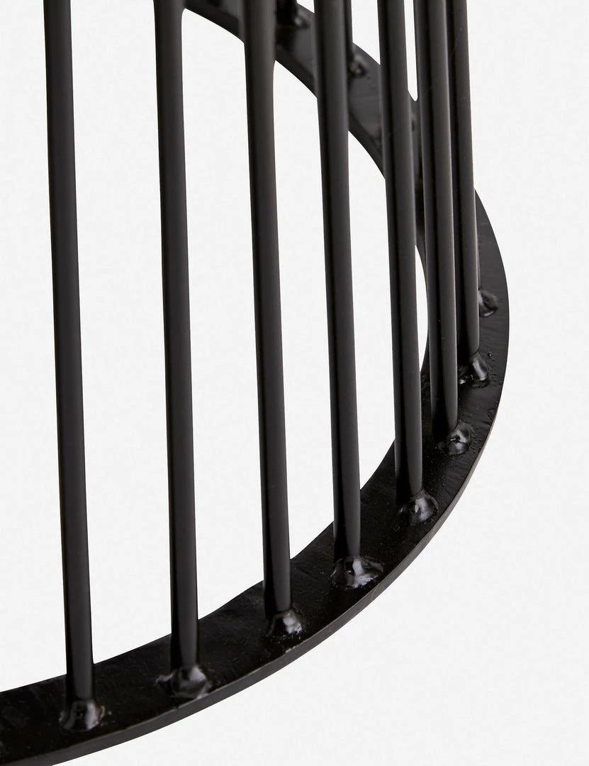 This round side table is a dream for open and airy spaces, featuring a tapered base constructed with iron spindles that let light shine through. The tabletop has naturally occurring irregularities in tone and texture, giving it an artisan-inspired finish.
