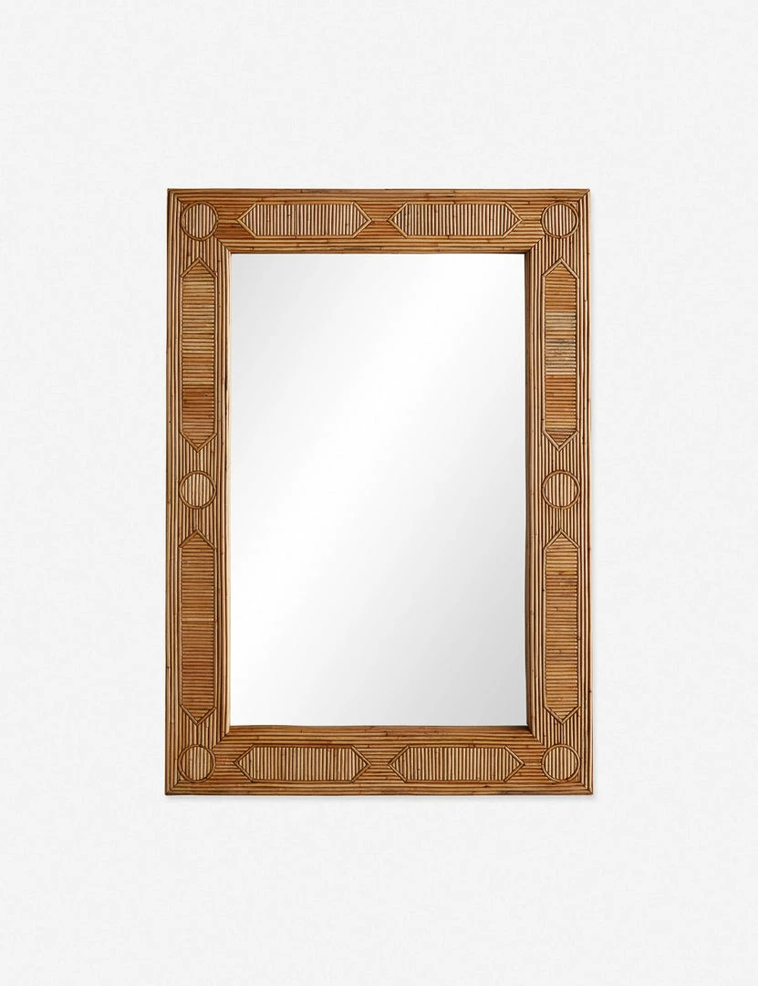 Inlaid rattan patterns evoke a warm organic tone with geometric appeal in this wall mirror design by Celerie Kemble. Layer this mirror into a look that pairs vintage elements with brass and natural accents for a richly collected feel.