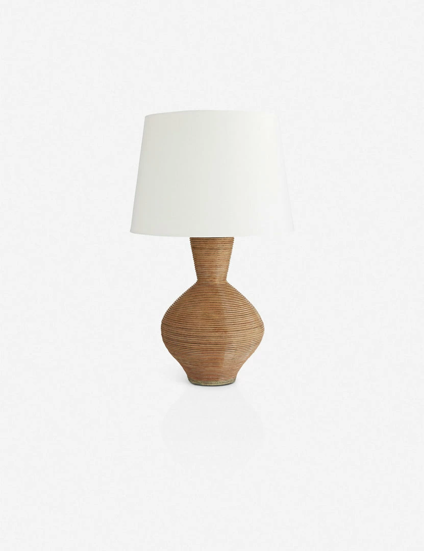 A traditional table lamp with transitional appeal, featuring a ribbed texture throughout and warm, organic tones for versatile styling options. Finished with an off-white linen shade.