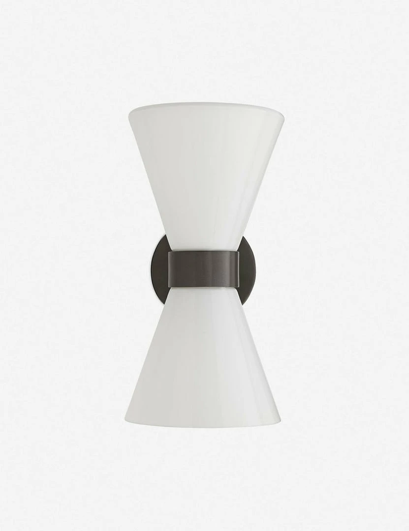 A modern update to the classic hourglass sconce, featuring opal glass shades that exude a warm glow. Designed for both indoor and outdoor use for extra versatility.