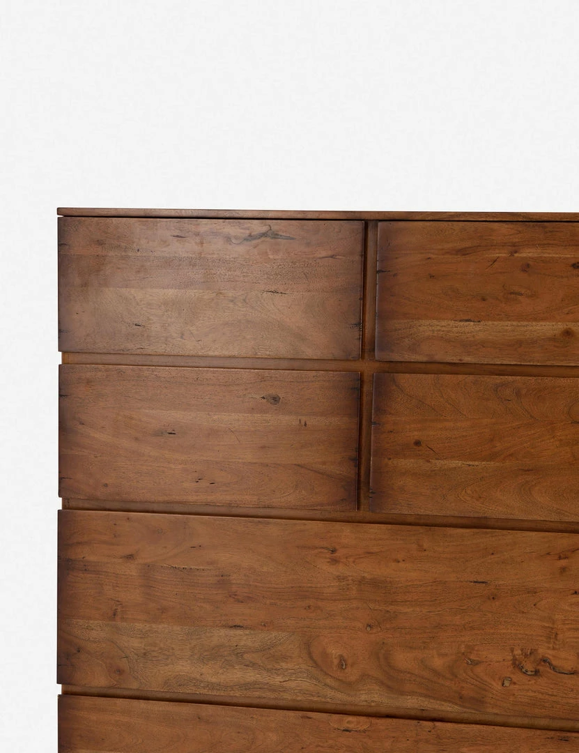 Fashioned from solid acacia wood, this dresser’s natural knots and graining offer a rich organic texture. A warm finish displays mid-century undertones and augments the knots and graining for a distinctively found feel. This tall design offers spacious six-drawer storage with a compact footprint.