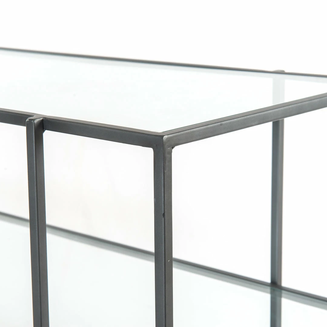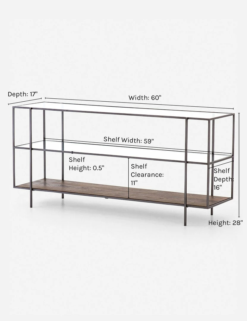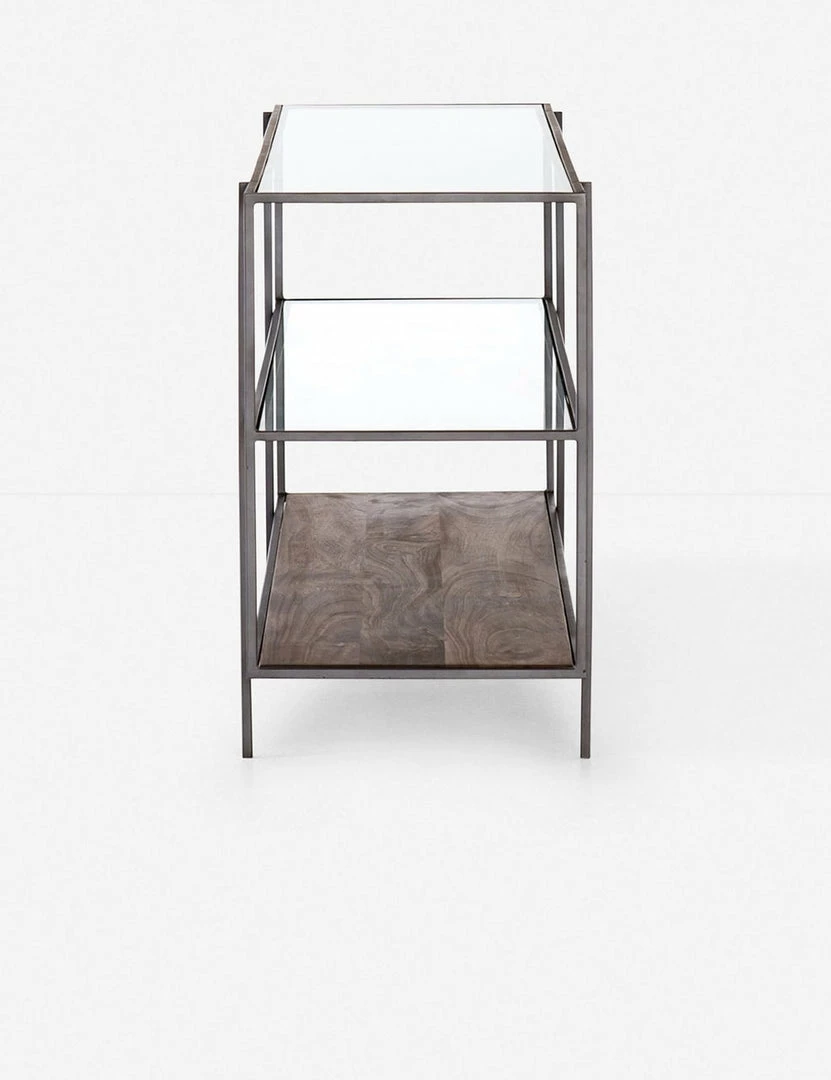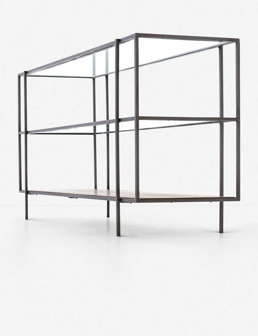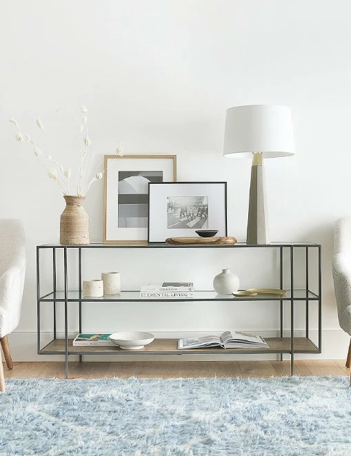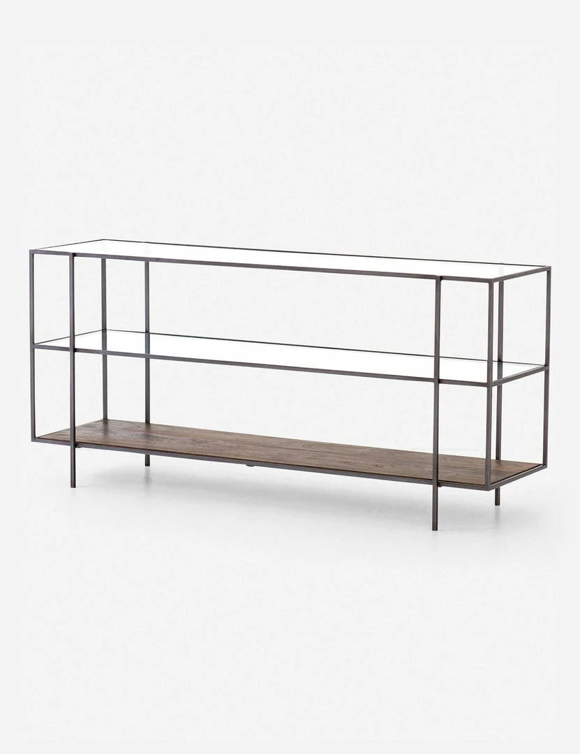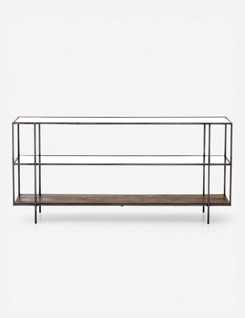 The juxtaposition between glass and wood make for an impressive display in the Asher Collection. A slim profile allows for placement in an entryway, and three tiers of shelving allow for maximum storage space to display trinkets, books, and other decorative objects.
