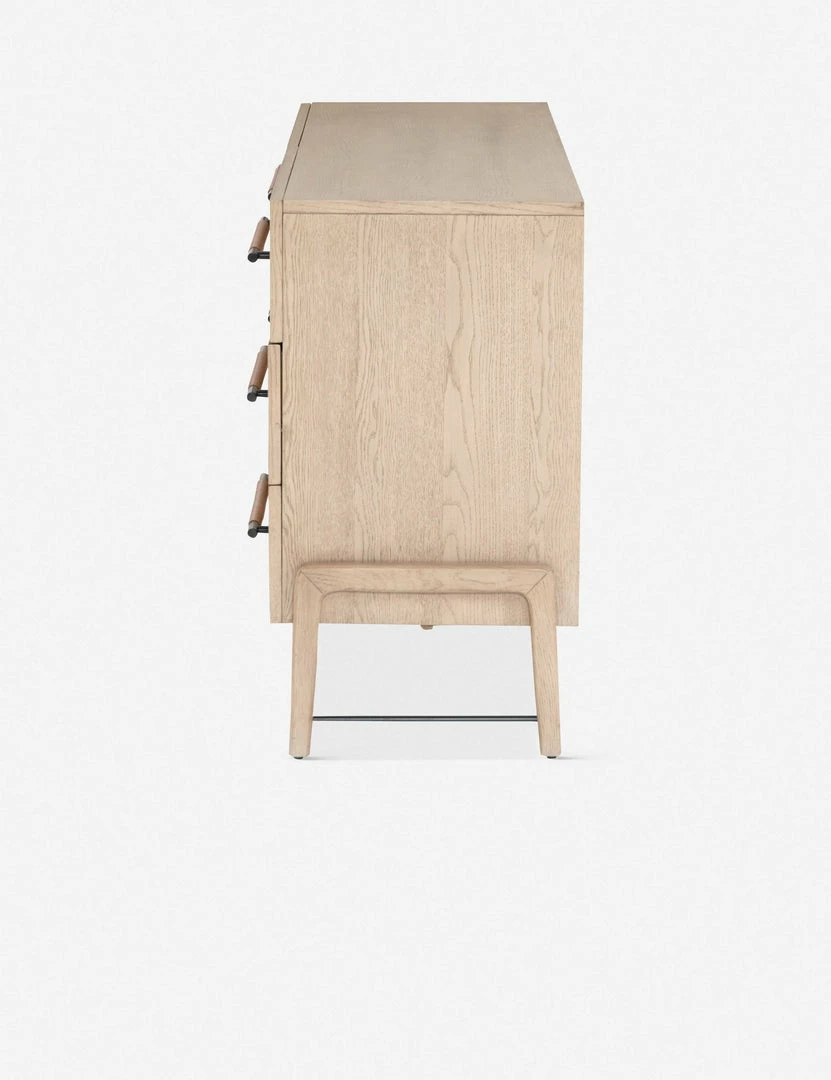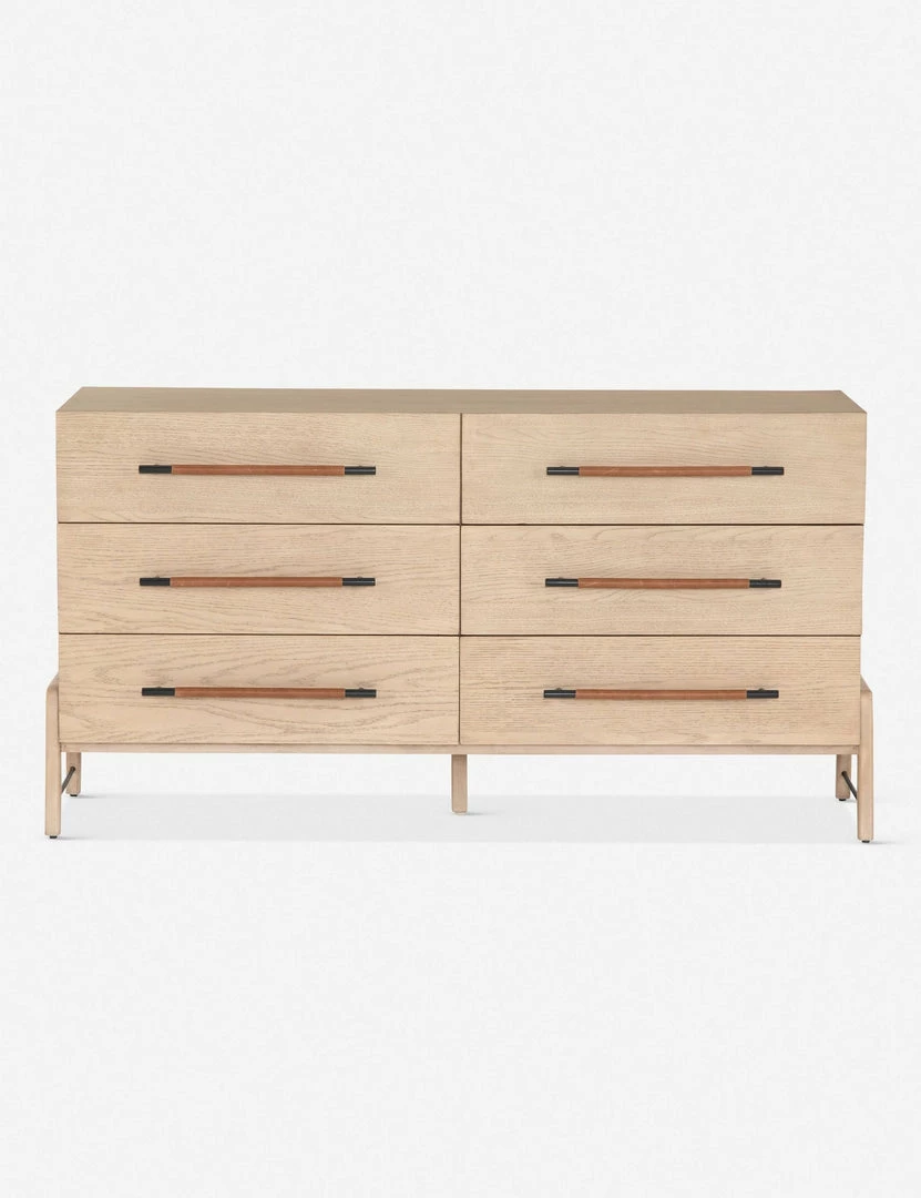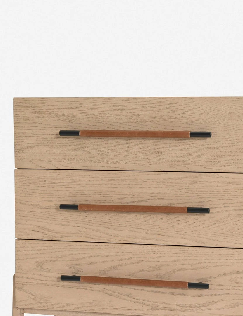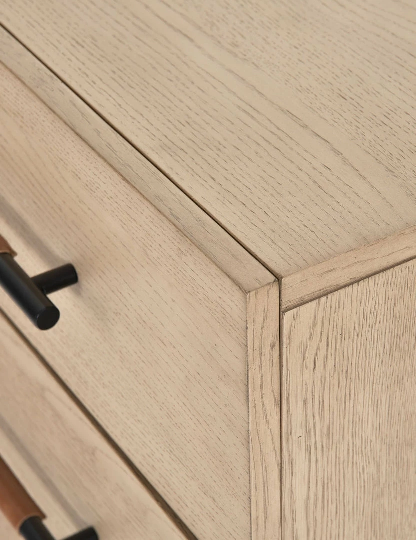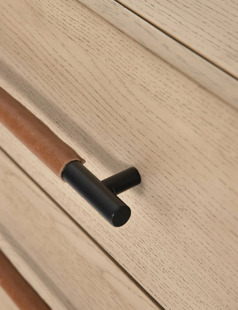 With its clean lines, sandy finish, and leather accents, this dresser brings a refined, minimalist effect to your bedroom. Constructed from solid oak and an oak veneer, it’s complemented by iron hardware and wrapped in tan top-grain leather. Six roomy drawers provide tons of storage space.