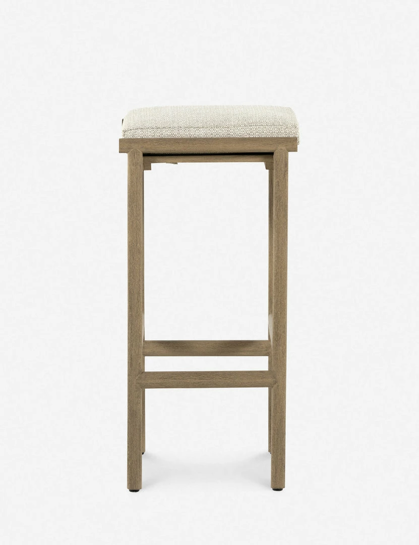 This bar stool offers a dynamic, flexible seating option with a solid teak frame and removable cushion, upholstered in a performance fabric designed to hold up against the elements. Perfect for a poolside bar or styled with a textural outdoor rug, this stool helps to create a laid-back transitional space filled with coastal undertones.