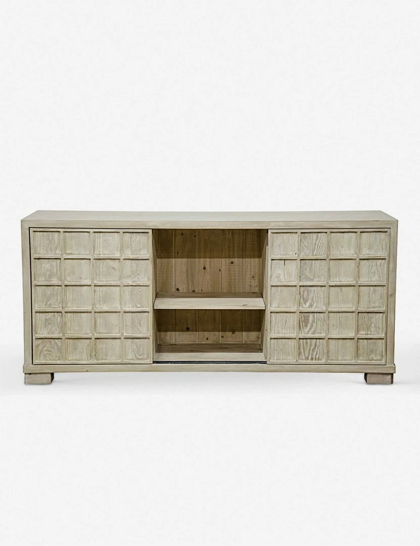 The raised grid pattern on the blank cabinet gives this piece a modern feel, while the reclaimed wood keeps things rustic. Sliding doors open to reveal ample storage space, perfect for concealing electronics in the media room!