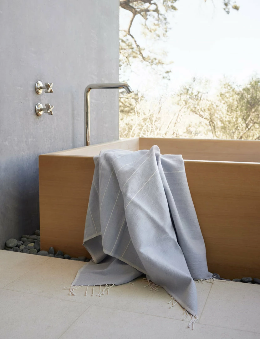 New York-based brand Bolé Road Textiles creates modern home accents inspired by, and lovingly hand-crafted in, Ethiopia. Made with breathable, handspun cotton, this oversized bath sheet wraps you up in a luxe spa feel. We love how the fringed ends gently complements this minimalist stripe design.