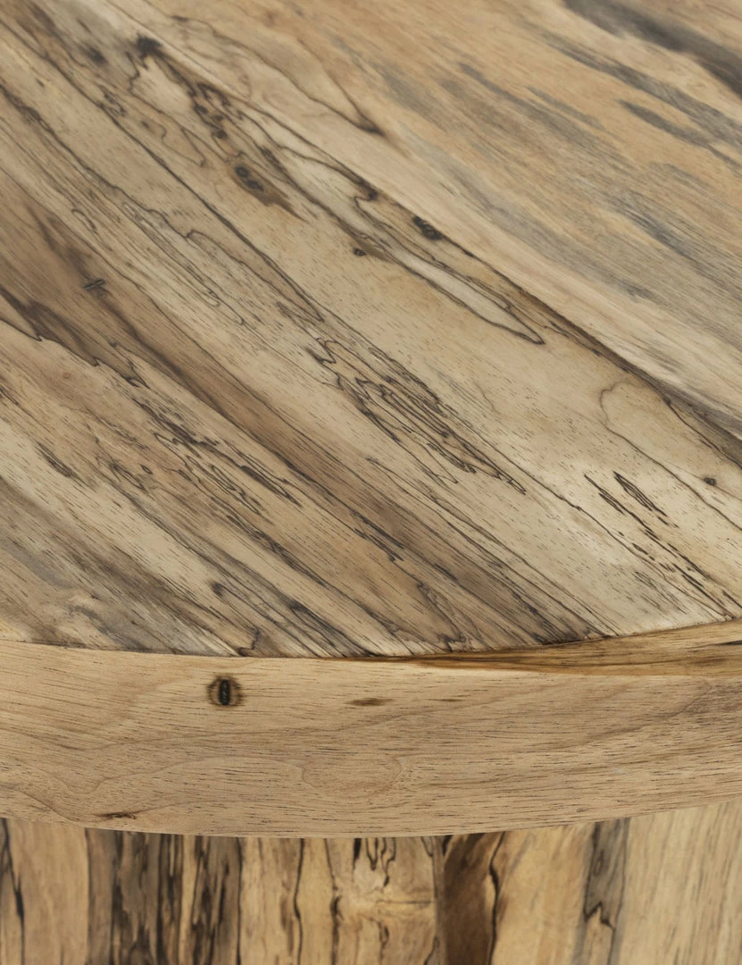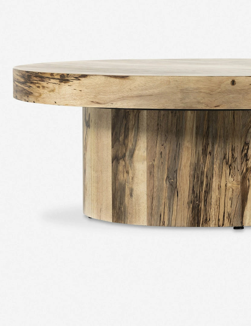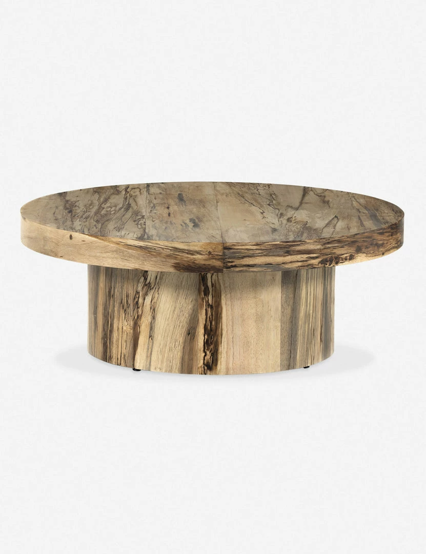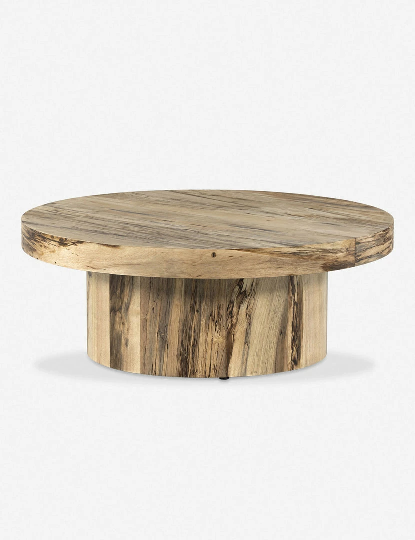 On a pedestal base, this coffee table offers modern design in a natural primavera wood finish that blends well with transitional spaces. The dramatic silhouette of this chunky wood coffee table construction creates the perfect anchor for an industrial aesthetic.