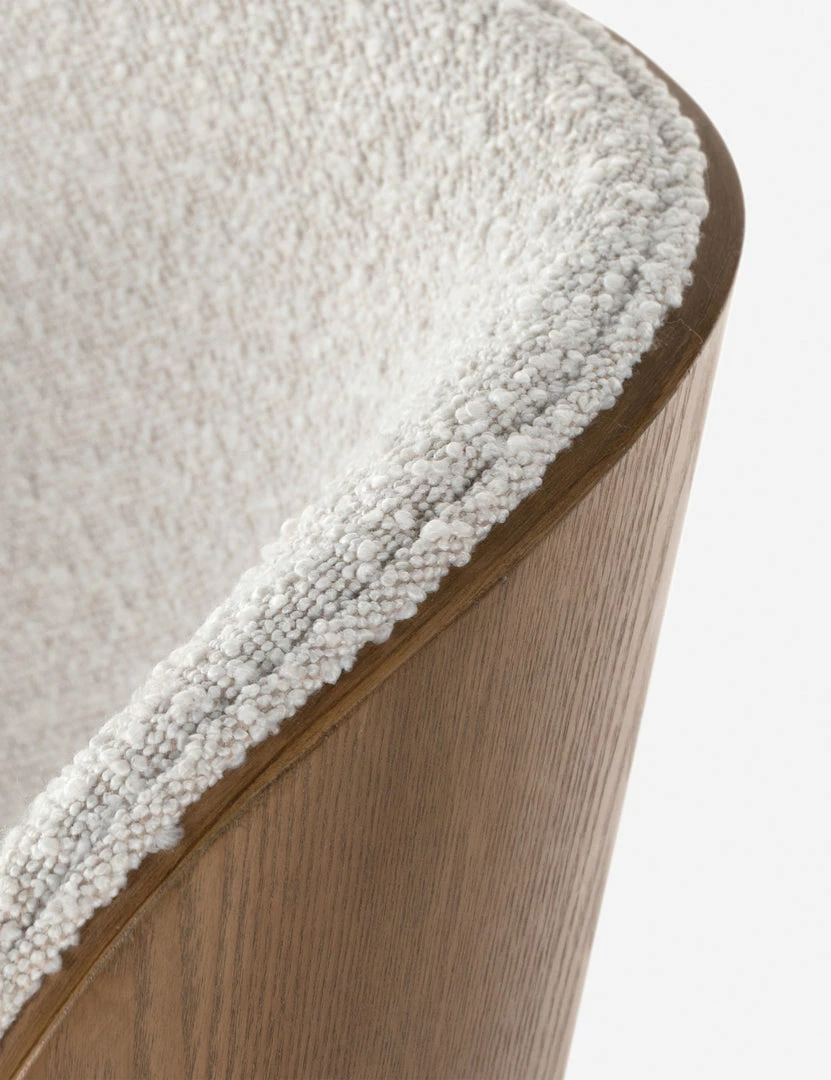 A timeless, modern bentwood-back with an ash veneer featuring a beautiful natural grain is set on a unique construction of solid ash legs with a swivel. Finished with a cream bouclé upholstery, this office chair is cozy elegance for everyday use.