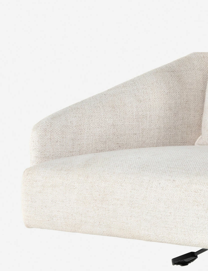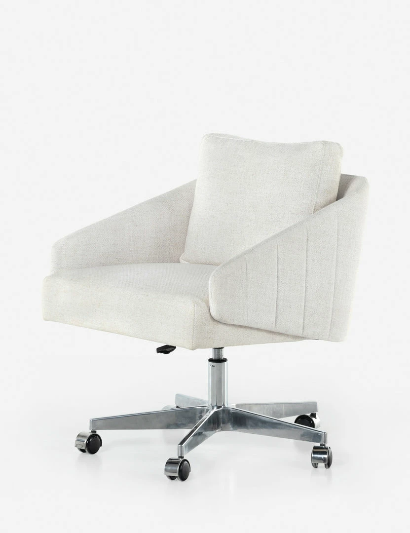 This office chair’s inviting design features clean, tailored lines set on a nickel-polished aluminum base complete with casters and an adjustable height for practical elegance. A blended fabric upholstery in a versatile light neutral tone makes for a soft but durable touch. Style this chair in a home office with warm neutral tones and layers of natural texture for a fresh, collected feel.