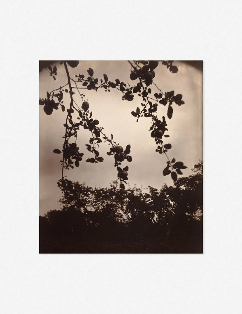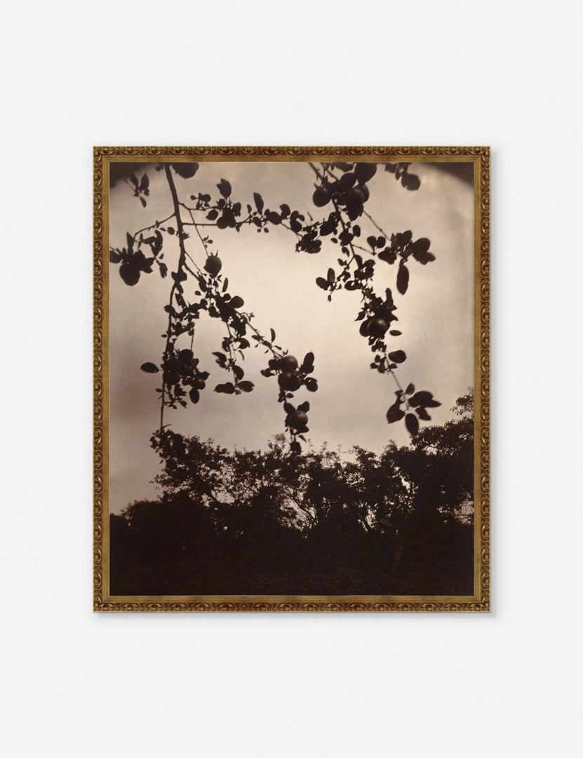 Looking up through branches laden with fruit, this monochromatic print offers a versatile wall art element bristling with organic inspiration. The soft focus and antique tones elevate this composition with a timeless appeal that can fold into any aesthetic for added visual impact.