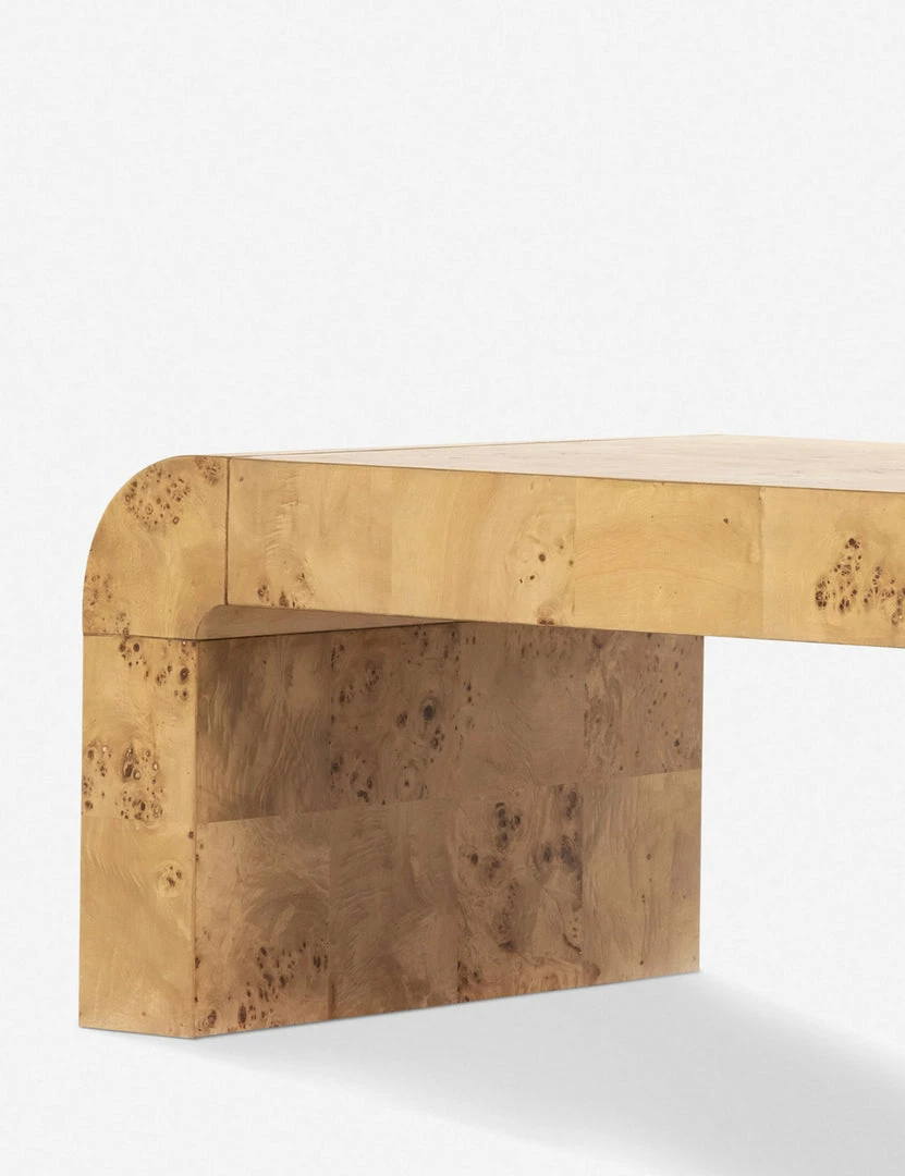 Clad in a patchwork burl wood veneer, this sleek coffee table offers your space a signature look. The curving waterfall design features a high polish finish highlighting its luxe natural grain. We love the seamless silhouette and warm tone this wood coffee table offers looks from deco to modern.