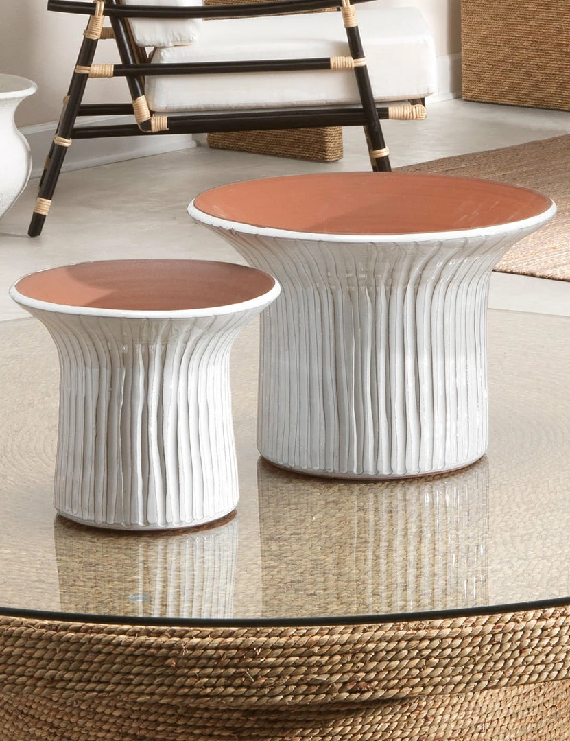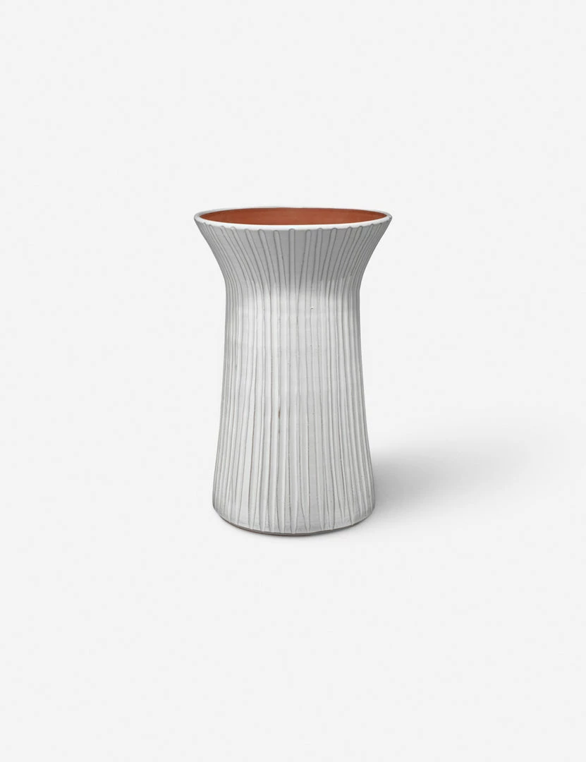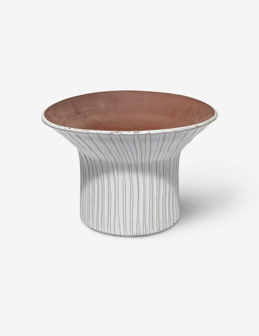 Handmade with a touch of contrast, this ceramic container pairs an off white outer glaze with a terra cotta basin for artisanal impact. The textural ribbing and flared rim set off a striking silhouette you can mix, match, and layer into any tabletop decor.