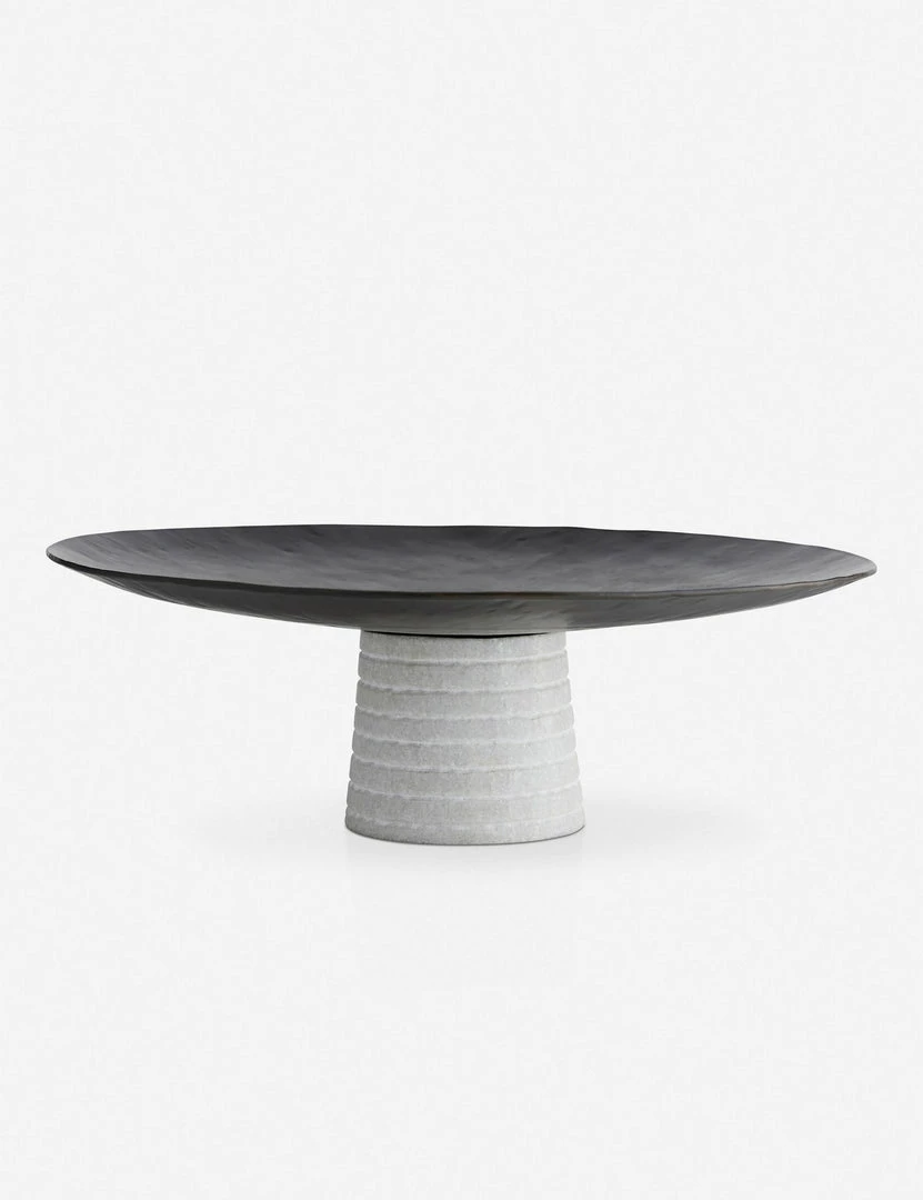 A unique mix of shape and texture defines this centerpiece accessory. A shallow, hammered iron dish perches atop a ridged ceramic pedestal to perfectly combine industrial materials and chic design.
