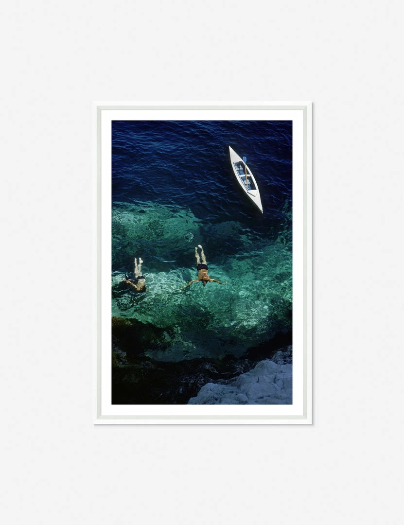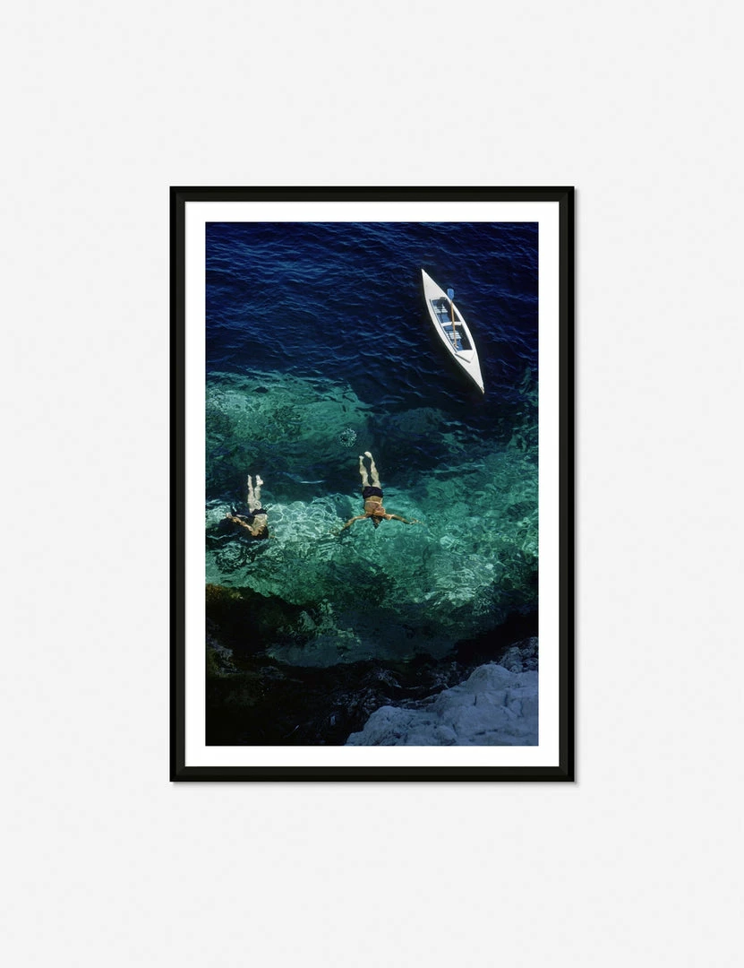 Two swimmers and a boat are suspended in a gentle blue sea in this sunny Italian island scene. Elevate your art wall decor with this vintage print awash with timeless tranquility. A black frame will complement the floating feel this wall art evokes.