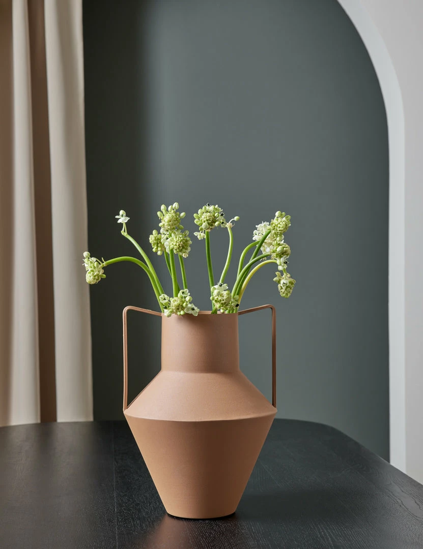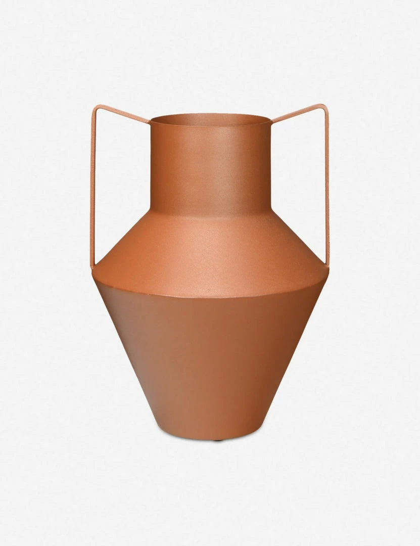 This earthy-rust toned and handled vase pays homage to ceramic traditions and craft with its water jug-inspired design. Crafted from iron, it is a beautiful and functional vase that is meant to be on display in your home, whether at the entryway, on a dining table sideboard, or on your coffee table.