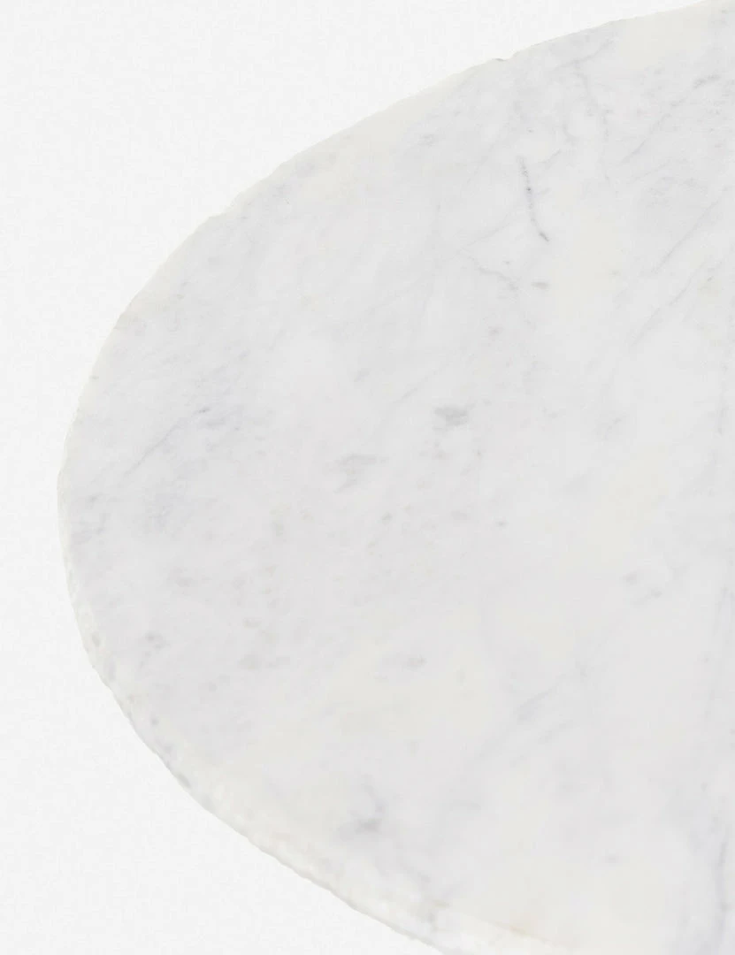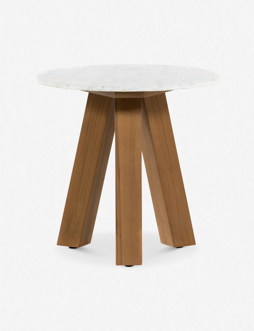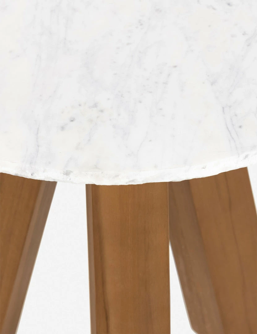 Mixed material design brings on-trend style with a distinctive silhouette to this marble and wood side table. The chunky splayed-leg base supports a round marble top with an unfinished edge for textural contrast. Float this luxe end table in your sunroom or outdoor lounge for a statement-making accent.