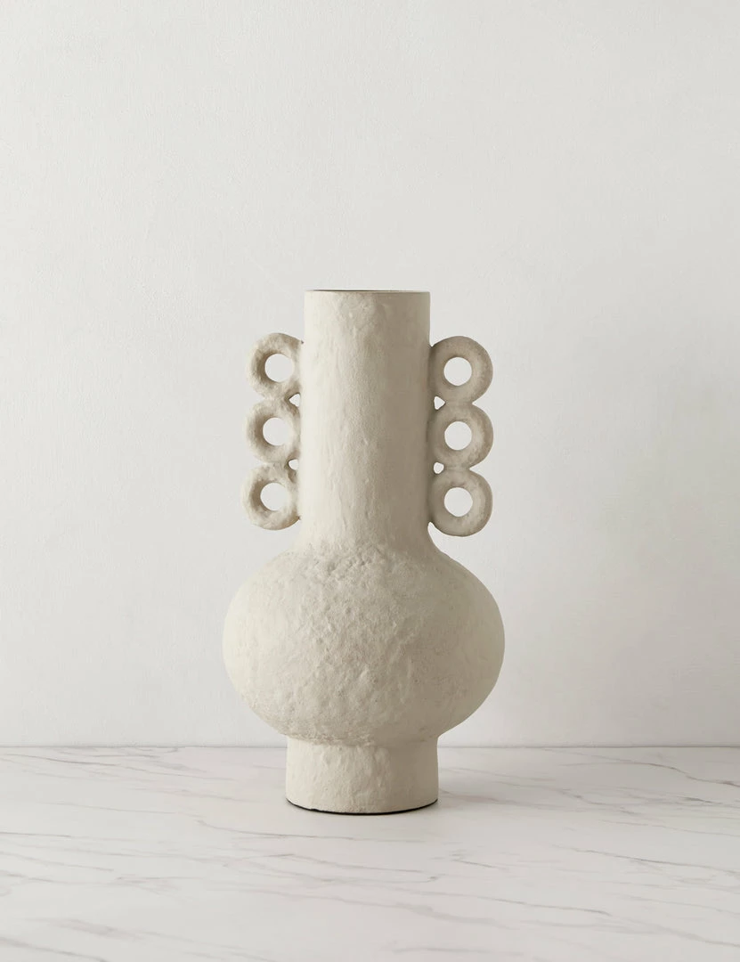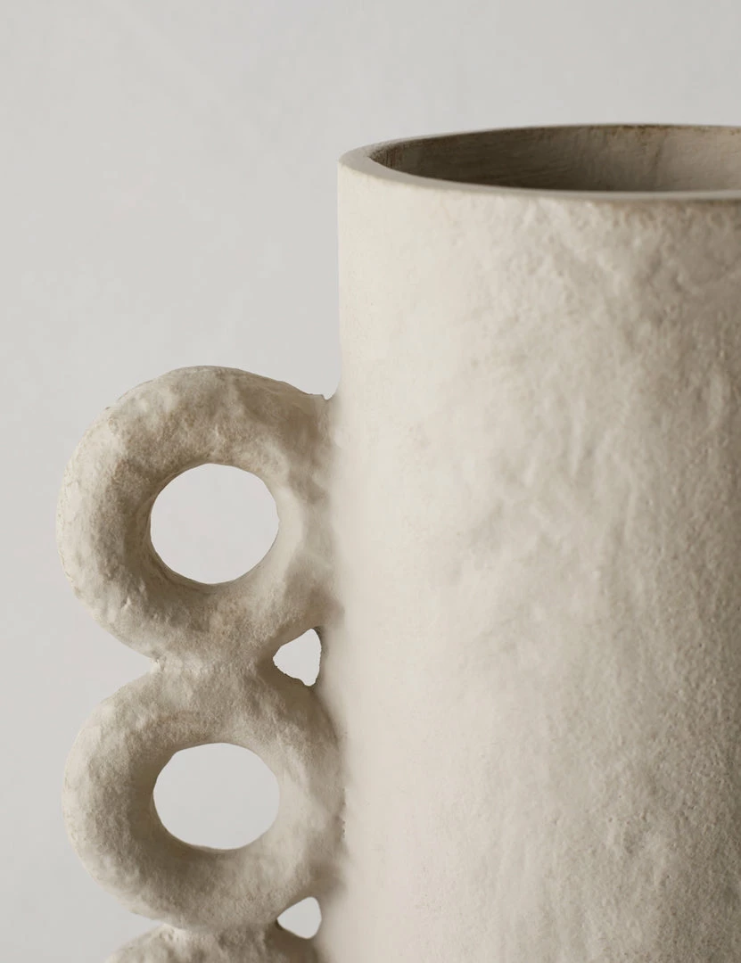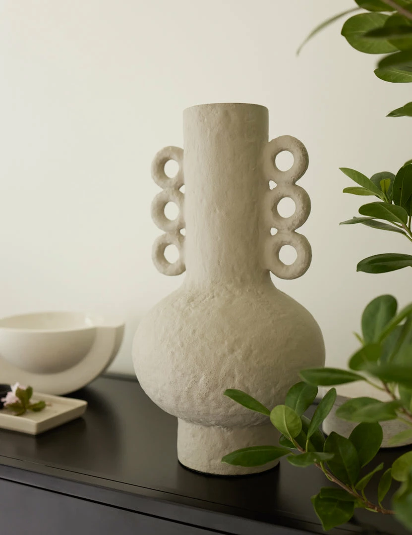 Playing on classic pottery designs, the Chandra Metal Vase features a clean silhouette and looping handle element in a beautiful grounding tone. The matte finish and dimpled texture highlight this metal vase’s soft sculptural lines, striking a balance between antique and modern for transitional appeal.