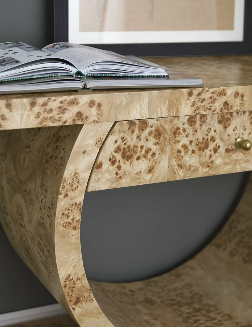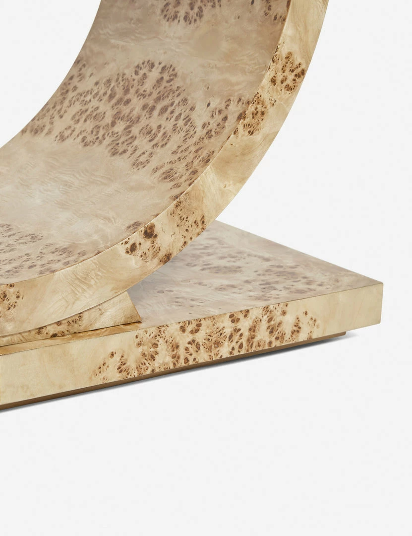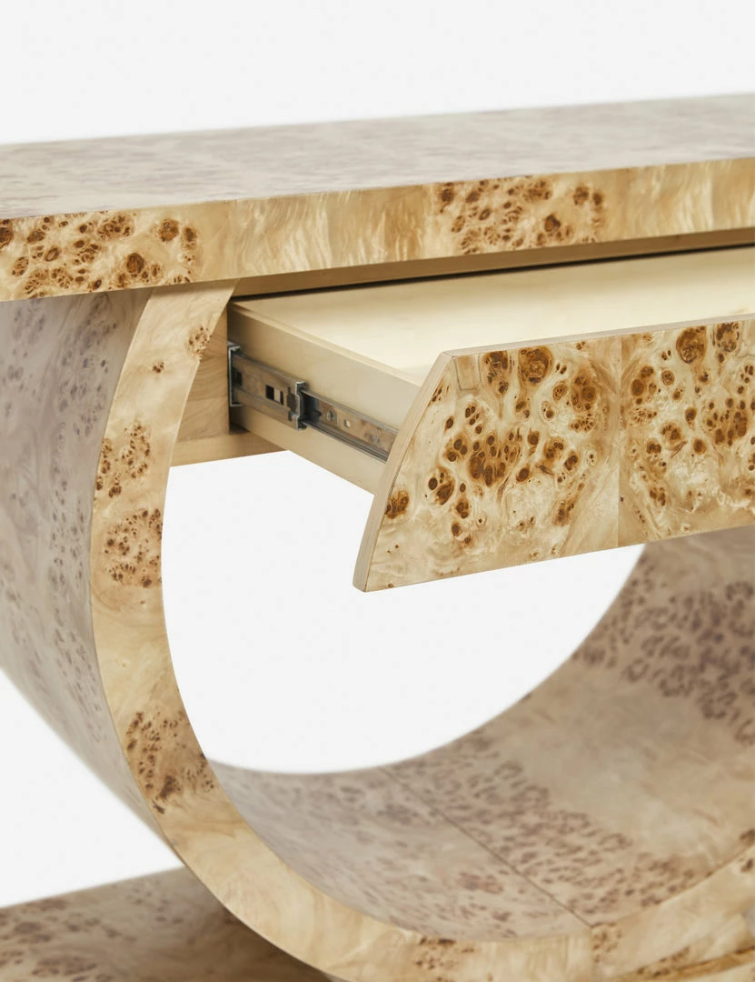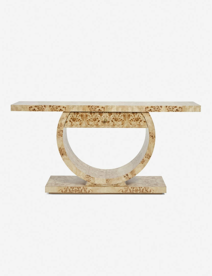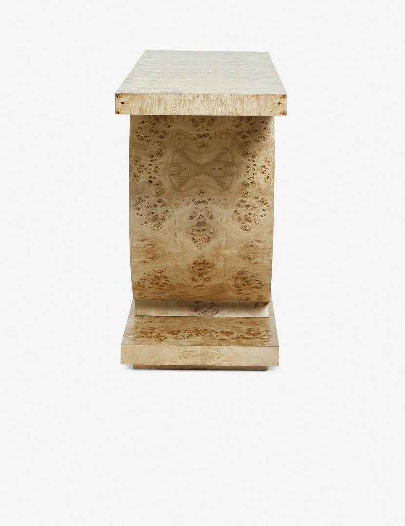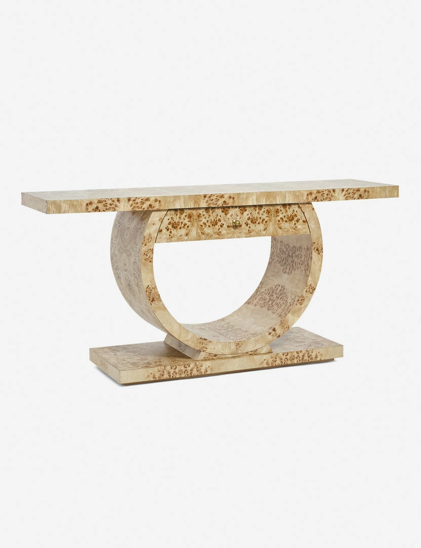 Make a bold statement in your living room or entryway with this luxe burl wood console table. The blend of angular and curving lines adds a dramatic appeal to this sculptural sofa table design, while the light finish sets the tone for looks from deco to modern.