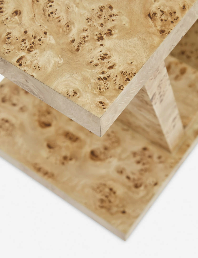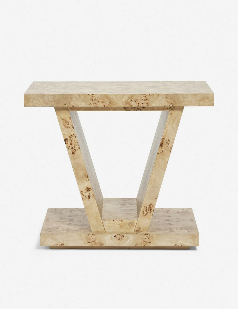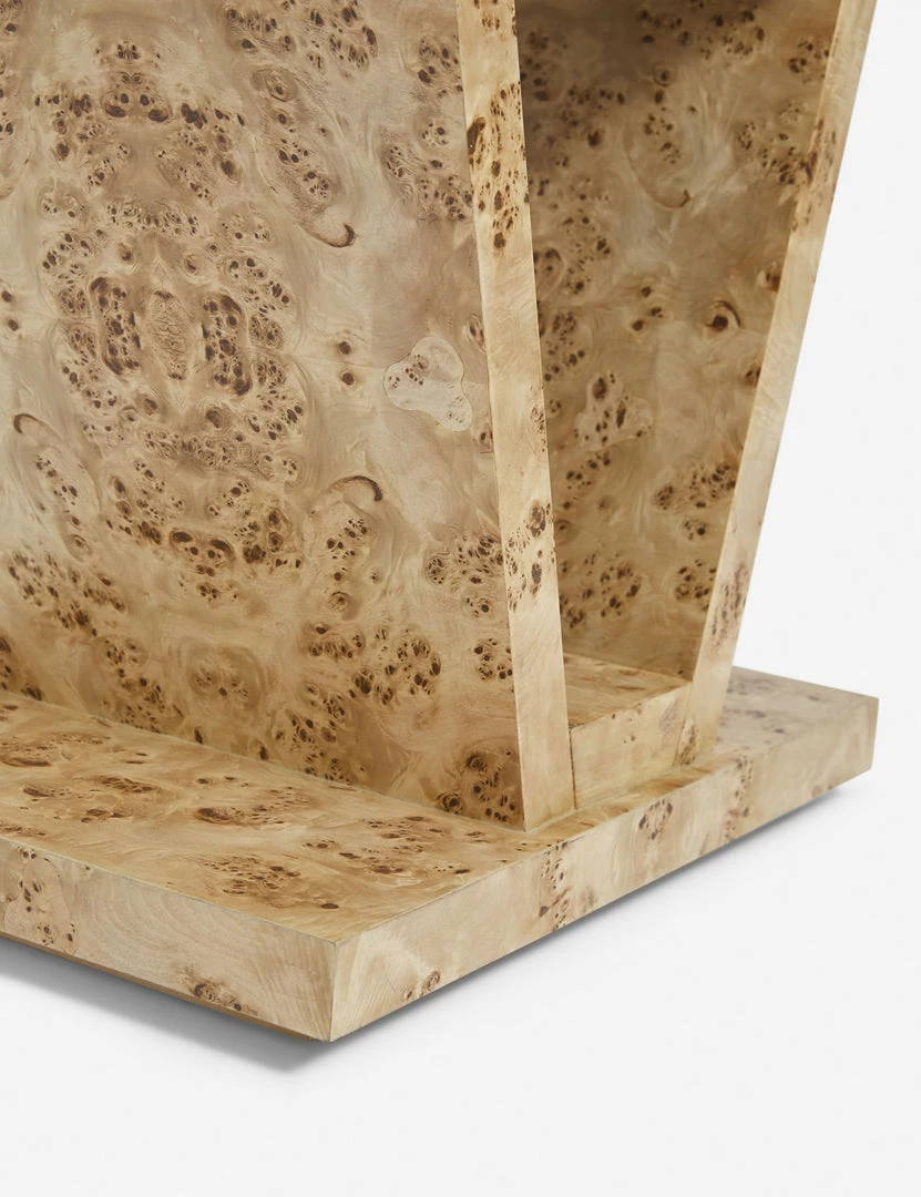 Make a bold statement in your living room or entryway with this luxe burl wood side table. The open, angular silhouette and light finish inspire a modern tone, making this end table an elevating accent for deco inspiration or refined minimalism.