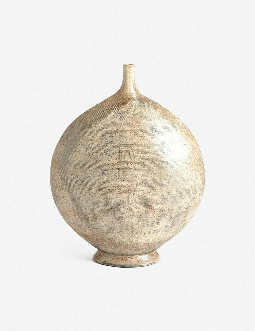 A thin round body and narrow neck offer a sculptural feel to this unique vase. Handcrafted in Portugal using the traditional Japanese Raku process, artisans dip each vase in sand before sealing them with a glaze to create an earthy, textural finish. Style this ceramic piece in your home office or entryway.
