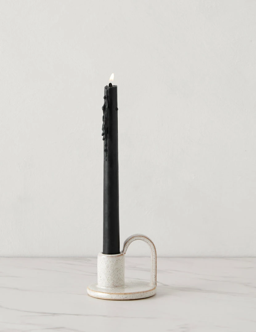 Bring a timeless ceramic charm to your mantle or tablescape with this handled taper candle holder. The reactive glaze features a speckled detail with browned edges for a tone tailored to farmhouse chic.
