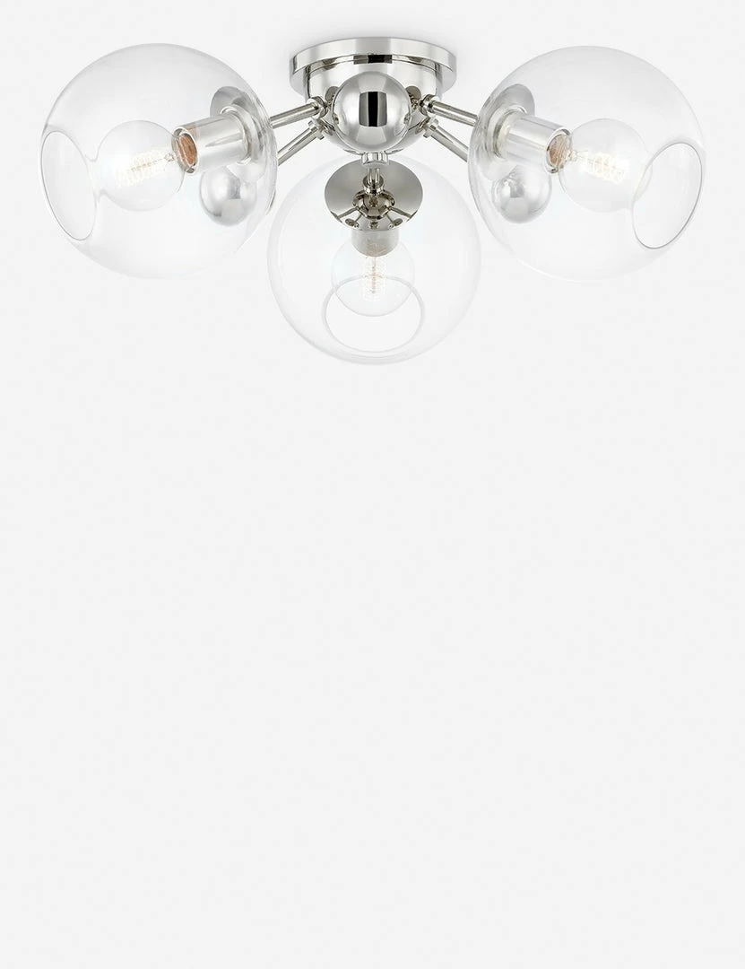 In a polished nickel finish, this three-light ceiling lamp is made from a striking mix of orb-like shades and spherical accents that will brilliantly cast and reflect light. Style this ceiling light in an airy space with plenty of bright neutral tones for a refined touch.