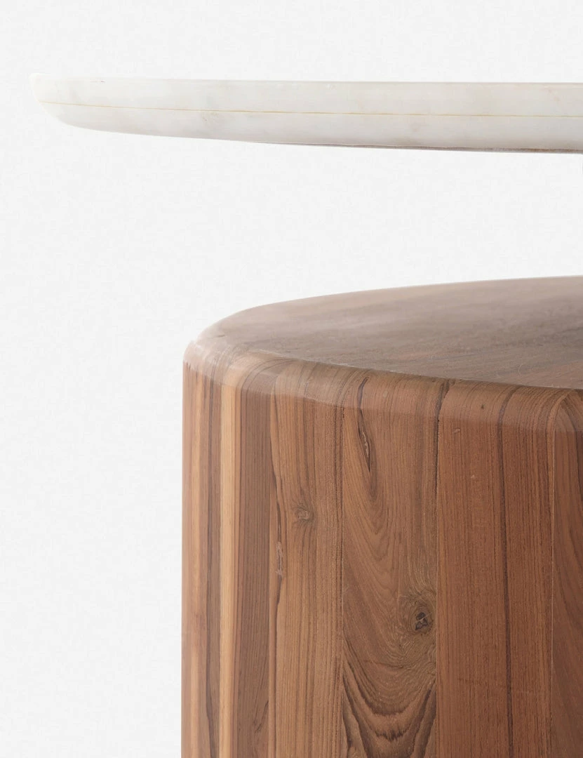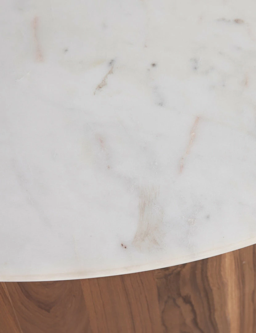 A round, subtly matte marble tabletop seems to float above the natural reclaimed teak base of this coffee table to form a bold centerpiece for your living space. Slim raw brass hardware connects top from base, adding a mid-century touch to this modern piece. Style it with oversized, rounded furniture and tonal, textural rugs.