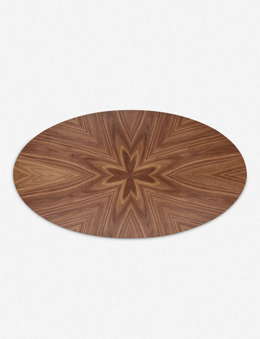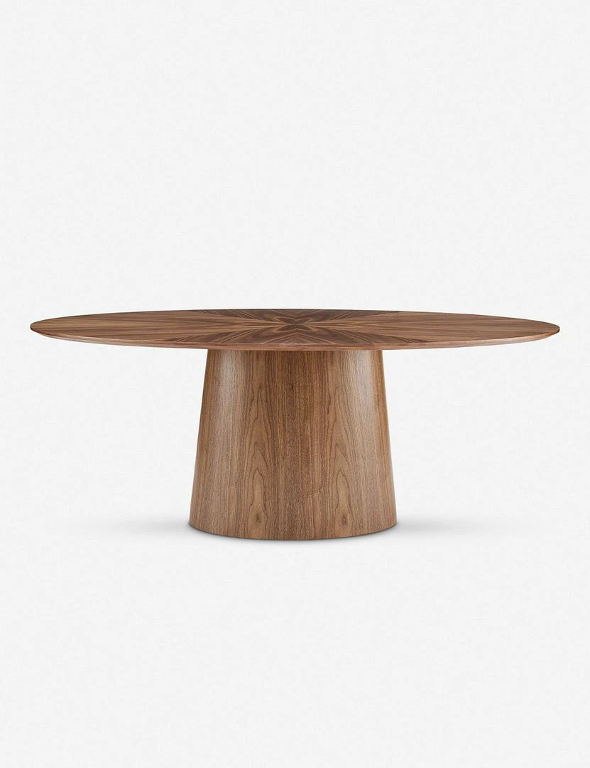Made from walnut, this oval table provides more space for dining and entertaining than a traditional round style. Although minimal in its silhouette, the top features a gorgeous star-like inlay pattern for subtle decorative detail.