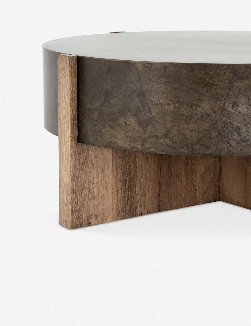 A distinctly modern coffee table with plenty of character. Designed with a distressed iron drum table, resting in an oak wood frame, this round coffee table mixes organic and industrial materials with effortless brilliance.