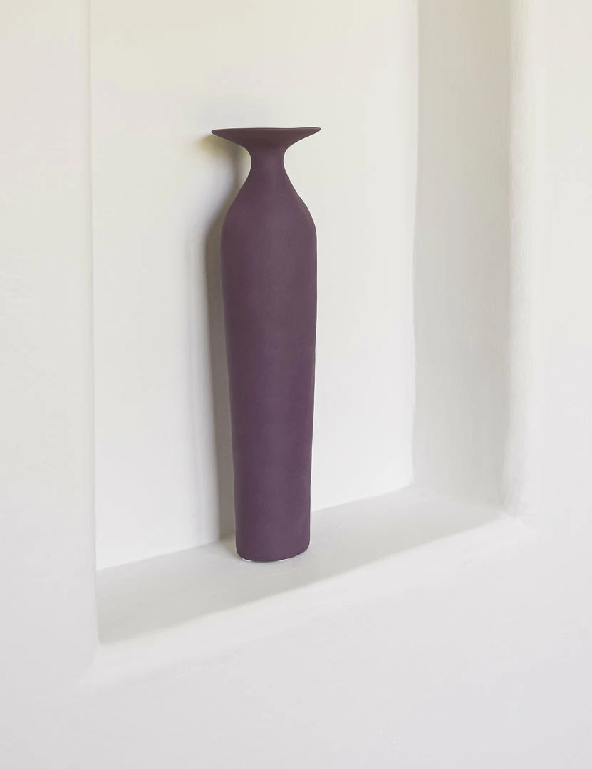 This hand-pinched vase reveals an artisanal touch underneath its clean, modern lines. Its narrow form pairs with a dusk-toned finish to offer a measured poise that will lend visual impact to a console table or bookshelf.