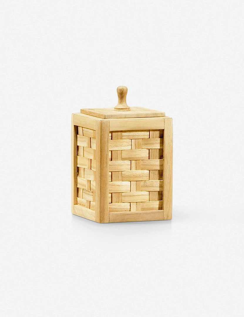 Keep your bathroom counters organized in style with this decorative Q-tip holder. This basketweave teak wood storage solution adds instant texture, while the natural materials keep your space feeling fresh and appealing.