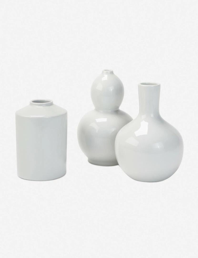 A glossy white finish highlight the natural forms and organic feel of this set of three earthenware vases. Intricately crafted from ceramic by skilled artisans, these vases are a standout accent styled on their own, on your coffee table, dinner table, or sideboard. Or, add a few sprigs and branches for a fresh vibrant look.