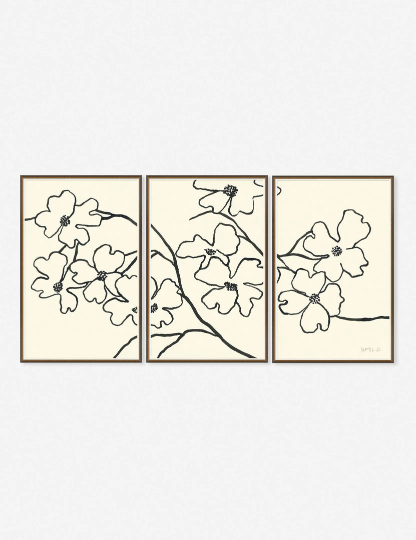 A single floral mural spreads across this triptych wall art set by artist Susan Hable. Her delicate line art captures flowering dogwoods in bloom with a profoundly understated beauty. Style this set of three wall art pictures to bring a sense of unity and dimension to a refined space.