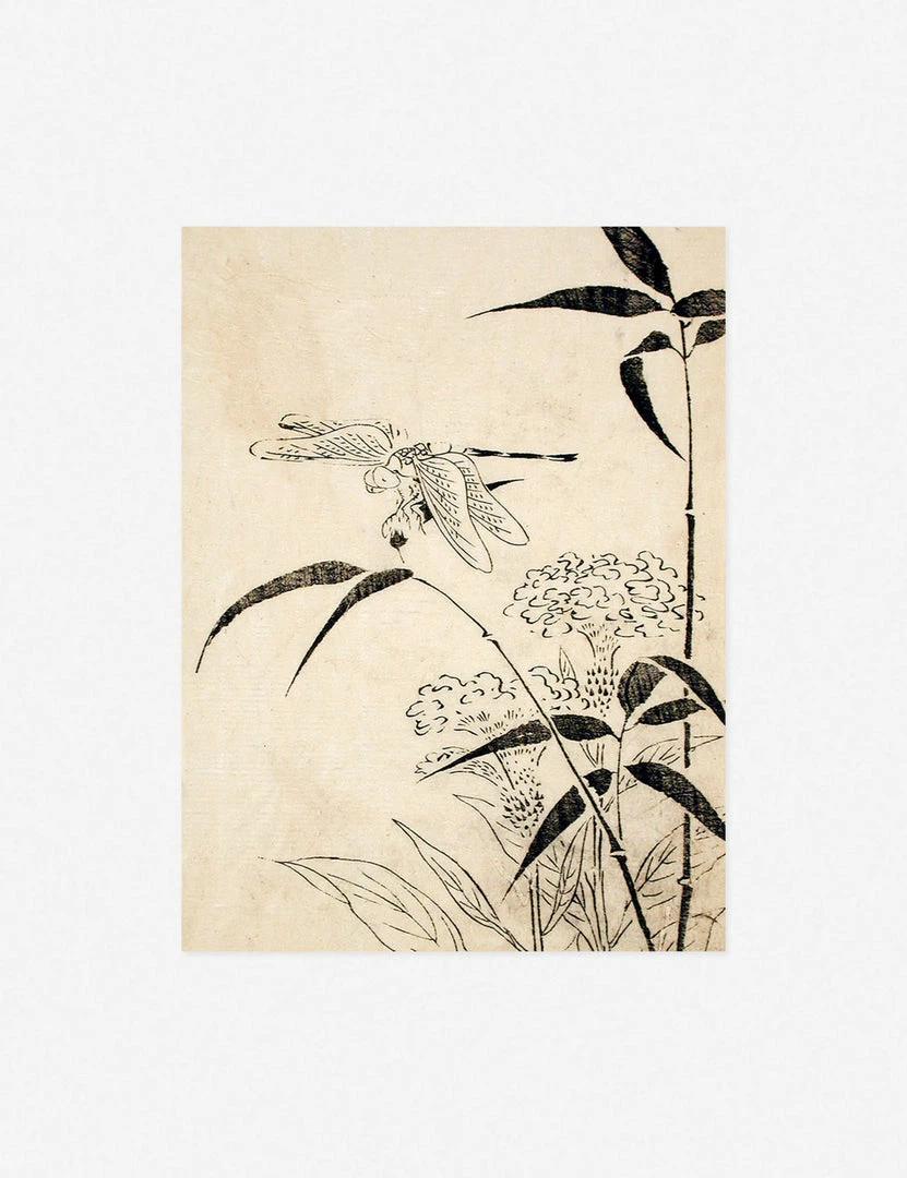 Simple botanical forms and an intricate linework dragonfly create a delicate natural scene in this wall art print taken from a book of Japanese woodblock art. Inspire your home office or living space with the timeless serenity of this understated wall artwork.
