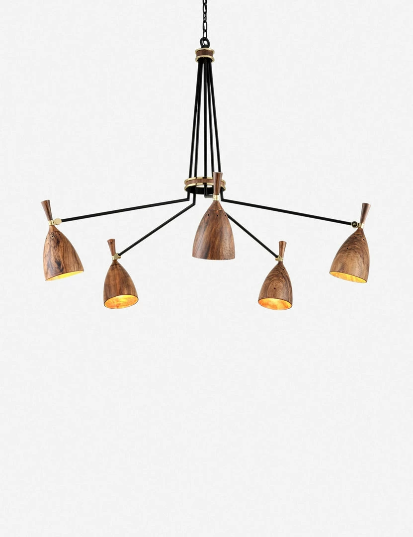 With a nod to retro style, the Gracie chandelier offers thought-out design while maintaining minimalism. A black metal frame connects to a series of wooden shades, offering an unexpected twist with its unique use of material.