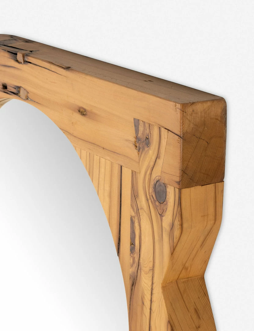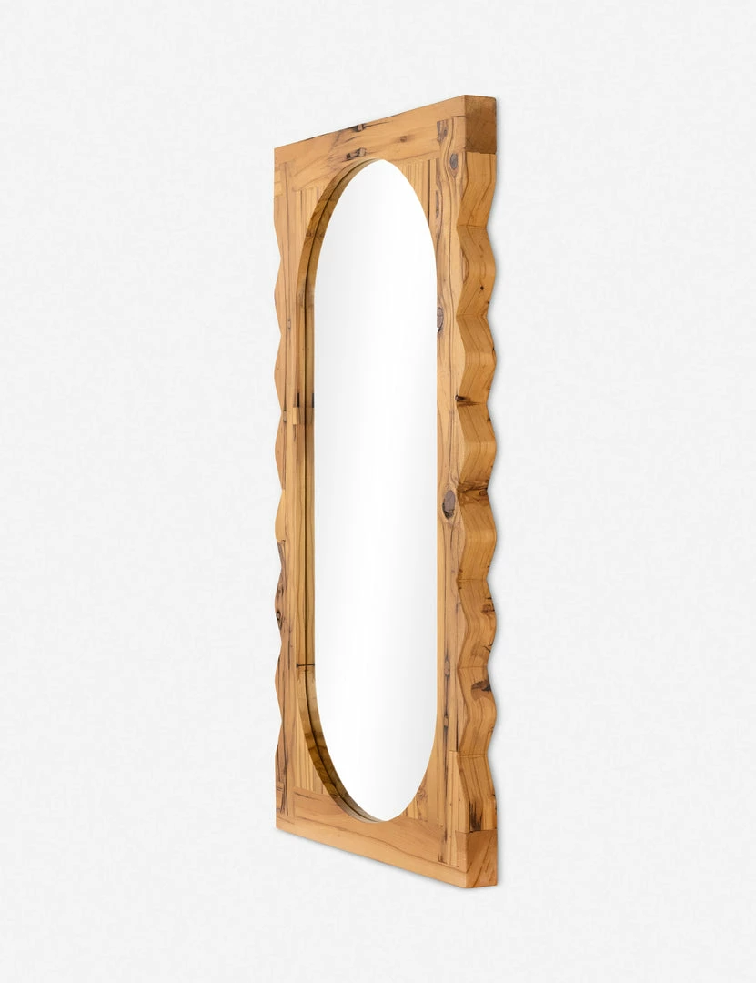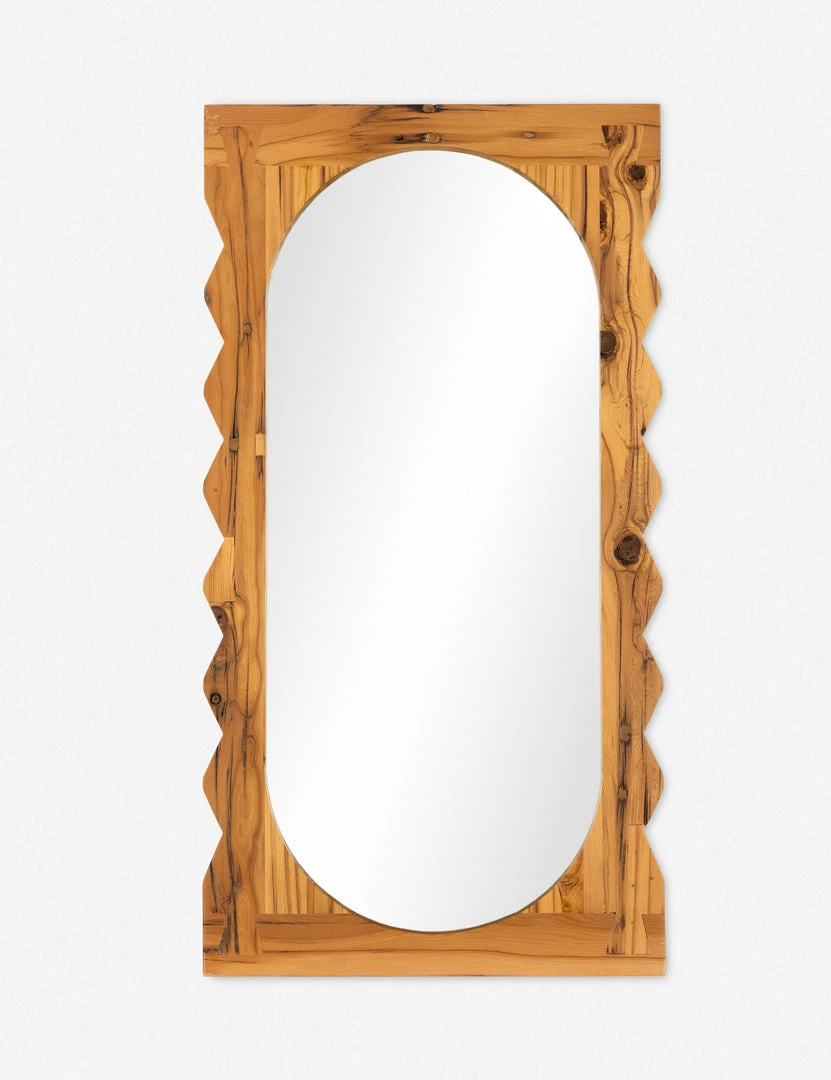 Inspired by Romanian sculptor Constantin Brâncuși, this reclaimed pine frame showcases an artisan touch with a hand-carved shape and beautiful joinery bounding an elliptical mirror. This large-scale floor mirror is a statement piece for your space that offers natural grain texture with a bold sculptural appeal.