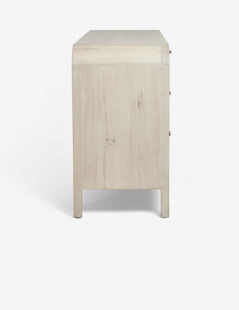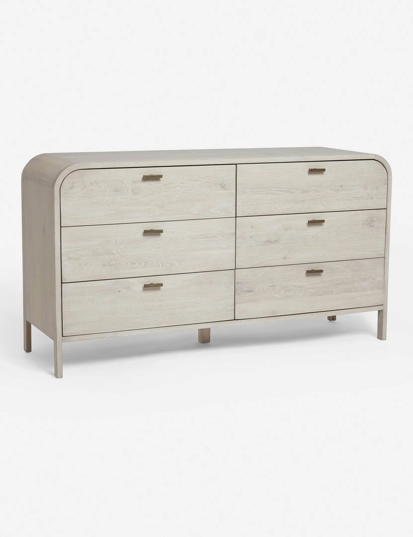 The whitewashed finish of this dresser warmly compliments the arched corners of its understated design. It is fitted with sleek iron pulls and six roomy drawers to offer storage and style in equal measure. Pair this oak wood dresser with a cozy rug and sculptural accents for textural contrast.