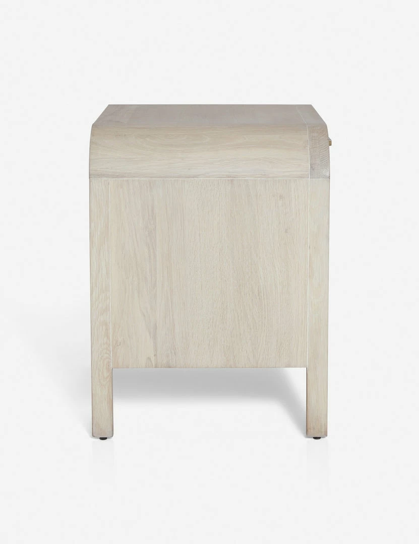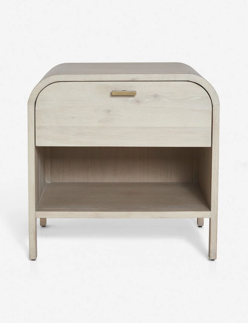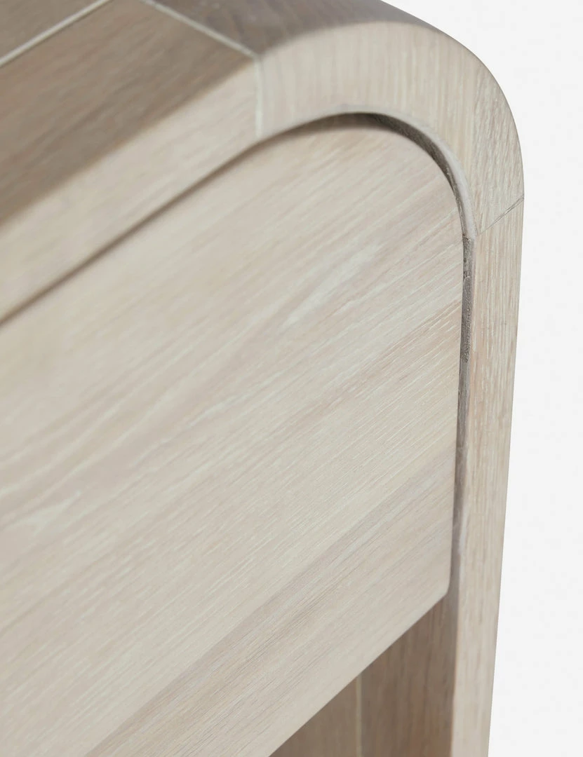 The whitewashed finish of this nightstand warmly compliments the arched corners of its understated design. It is fitted with a sleek iron pull, a roomy drawer, and an open shelf to offer storage and style in equal measure. Place this oak wood bedside table in a modern, airy bedroom.