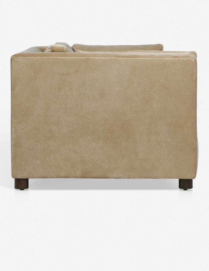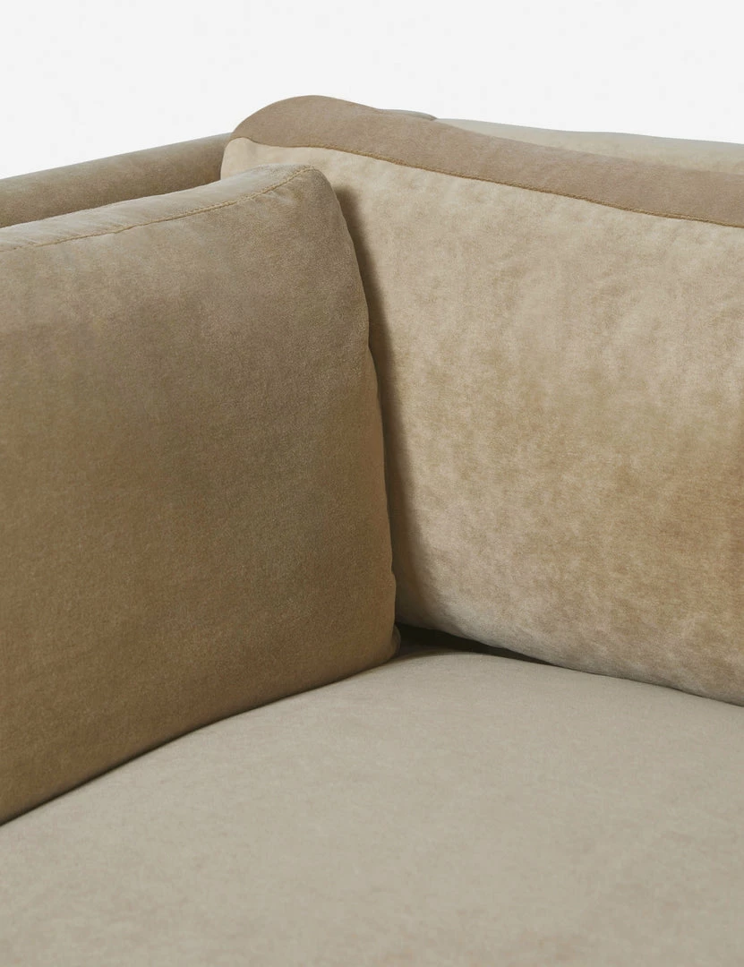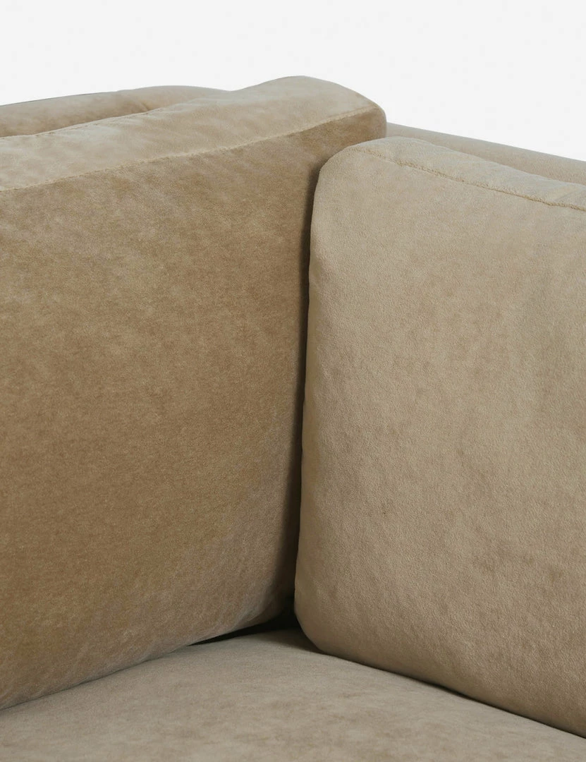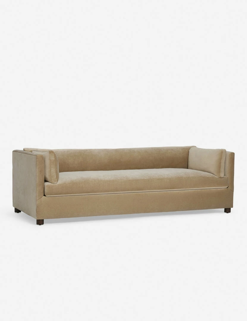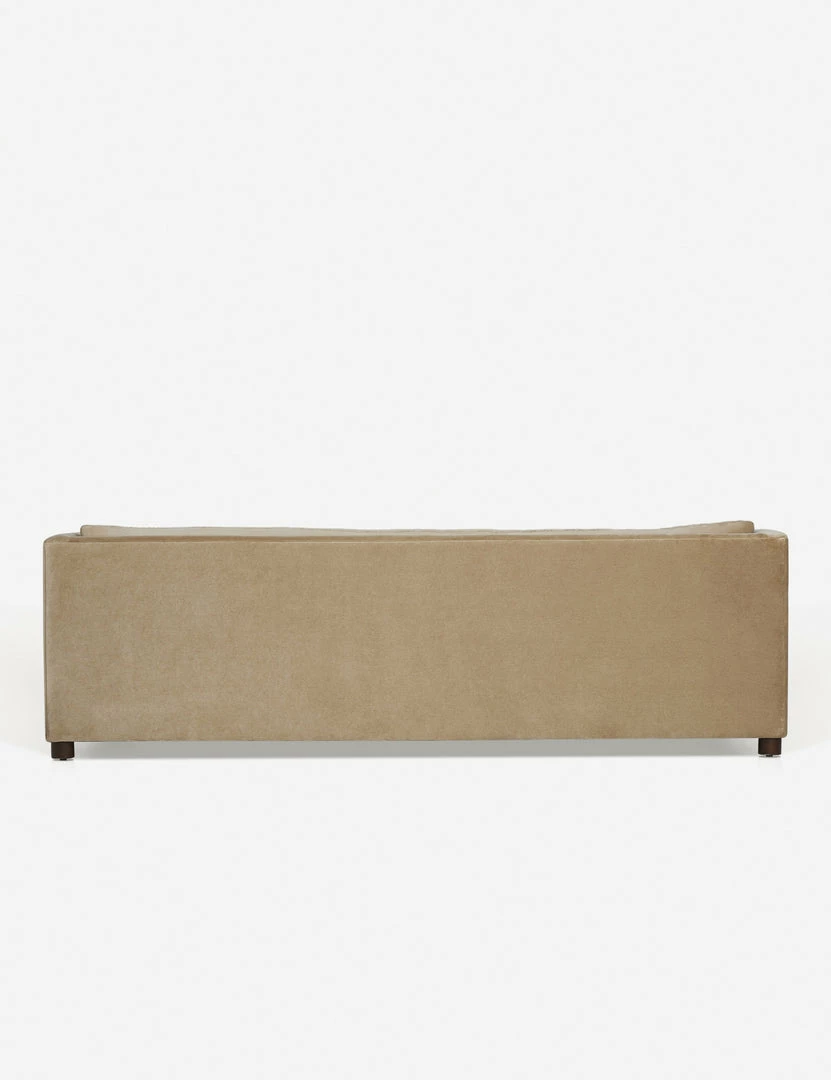 Finely-textured velvet upholstery accentuates the clean lines of this sofa. Its earthy cashew tone, deep seat, and shelter-style design offer a refined look for a grounded space. Style this couch with some luxe throws and sculptural side tables to elevate its soft visual appeal.