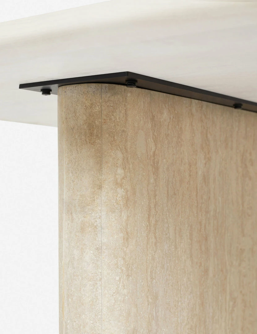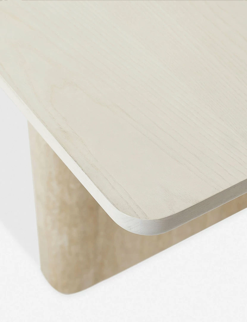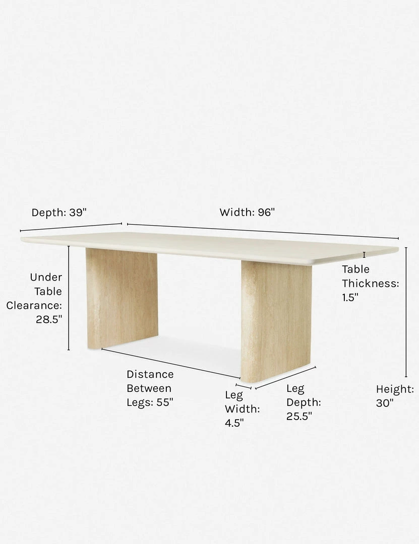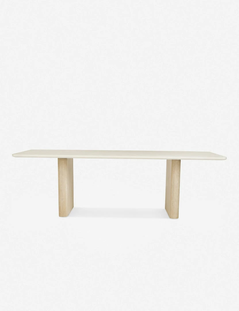 The Embrey Dining Table is an ethereal, minimalist statement maker. A slim-lined, rounded-edge top in an ash veneer finish stunningly complements the warm-earth toned coloring of two wide travertine legs. We love this expansive dinner table partnered with sculptural, tonal chairs.