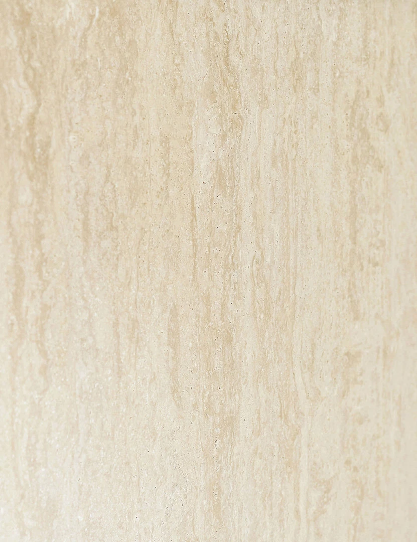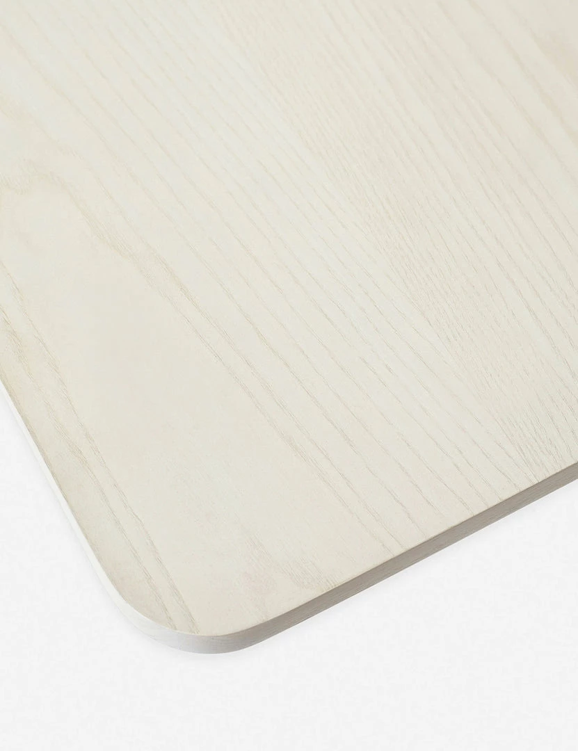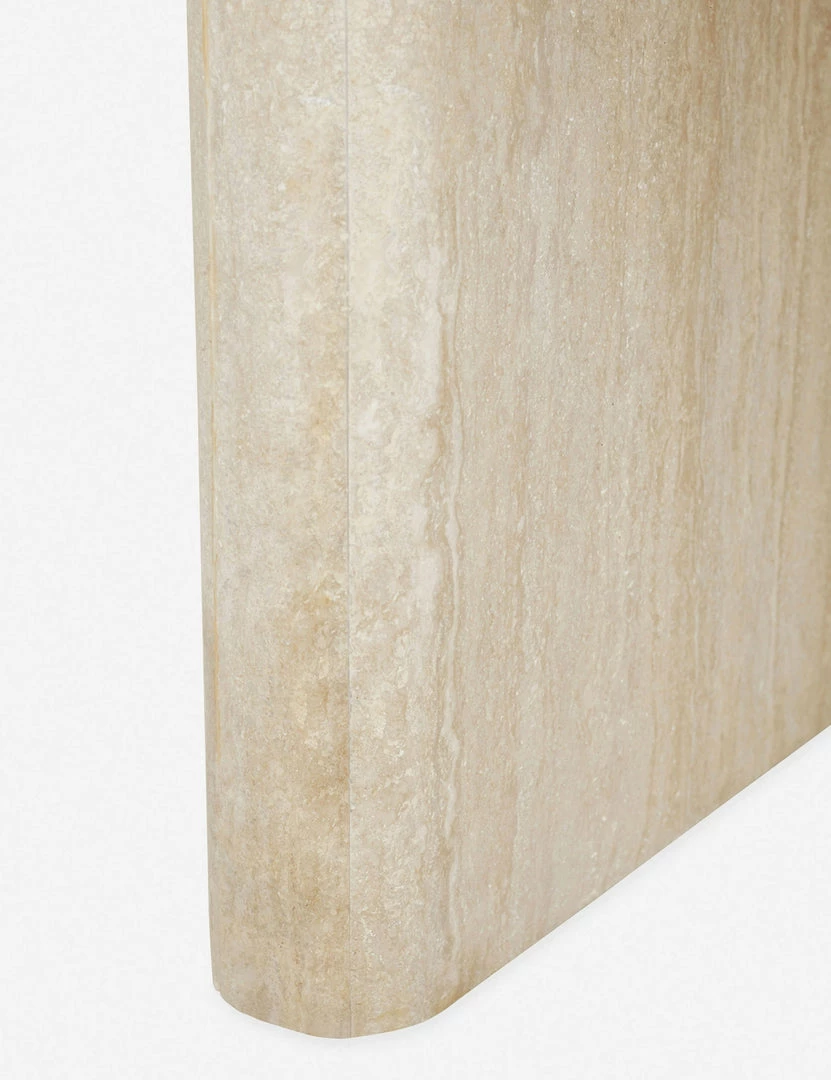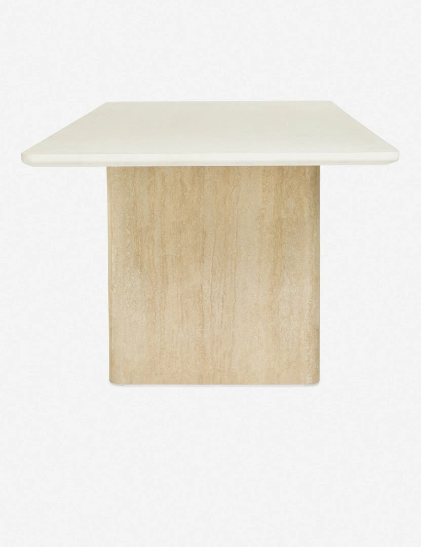 The Embrey Dining Table is an ethereal, minimalist statement maker. A slim-lined, rounded-edge top in an ash veneer finish stunningly complements the warm-earth toned coloring of two wide travertine legs. We love this expansive dinner table partnered with sculptural, tonal chairs.